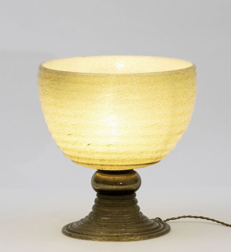Lampada da tavolo in vetro pulegoso pagliesco cordonato su piede a tromba.