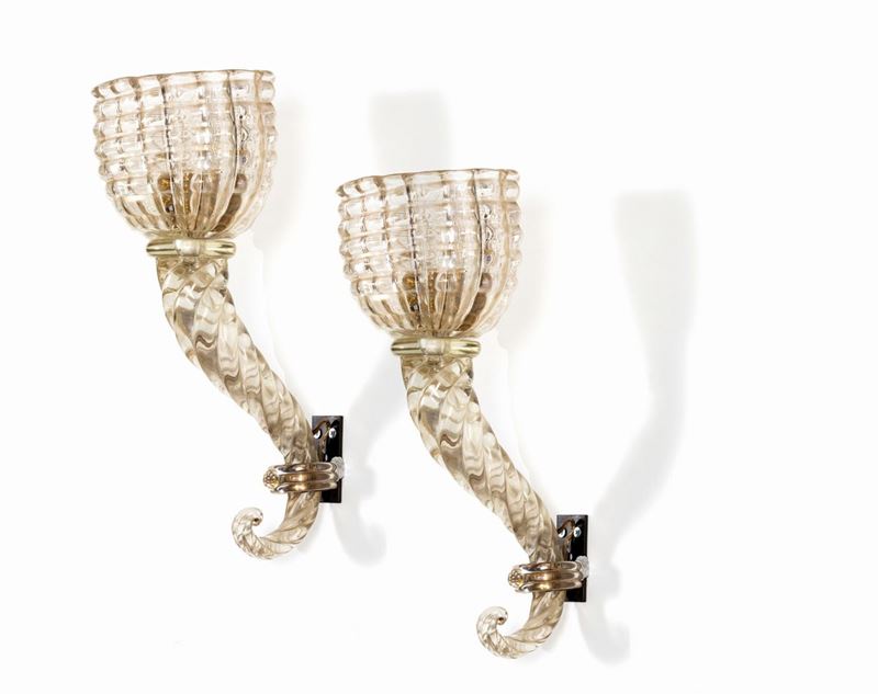 Coppia di appliques a cornucopia in vetro Diamante con diffusori ovali sagomati con superficie fortemente iridata.