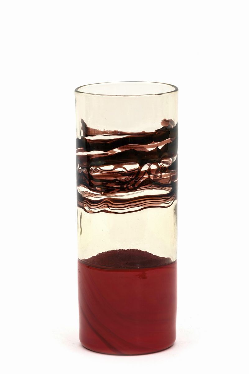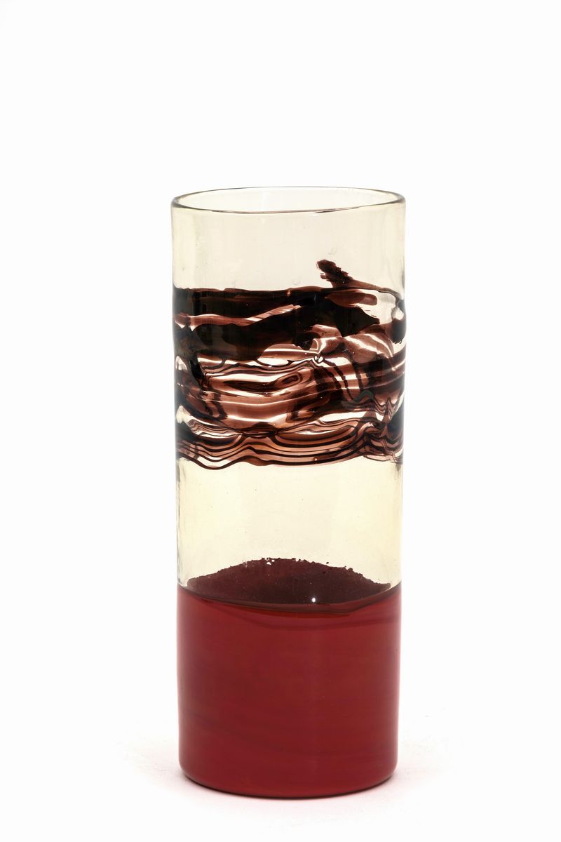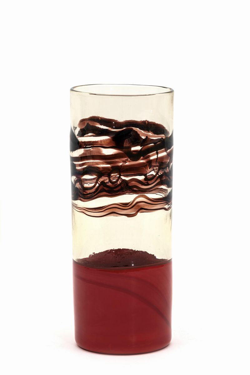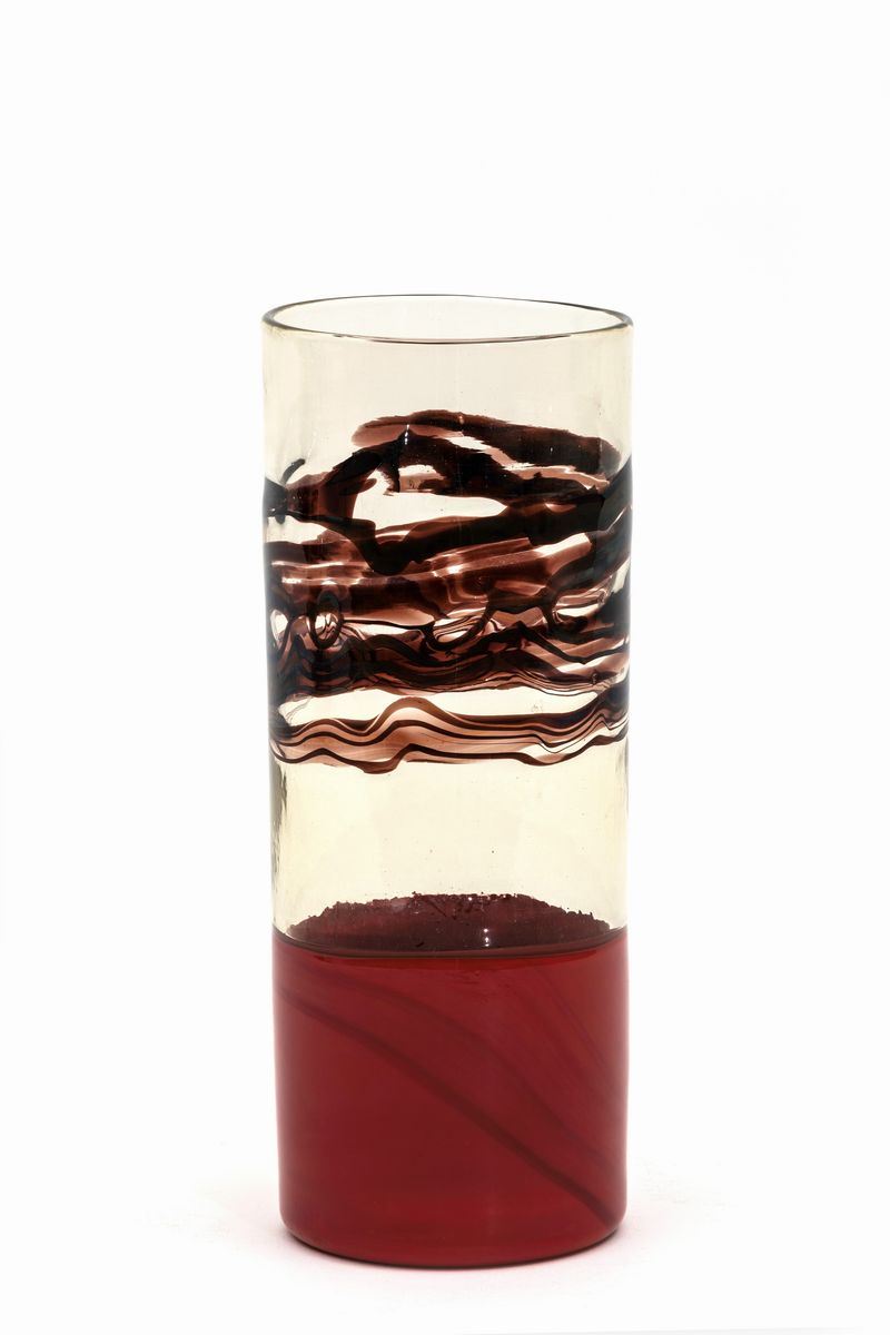 Vaso a cilindro in vetro soffiato pagliesco incalmato con fasce applicate. Base in pasta rossa.