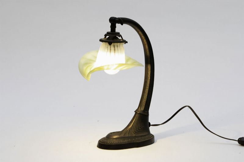 Lampada in ottone lavorato con diffusore in vetro soffiato a costolature.