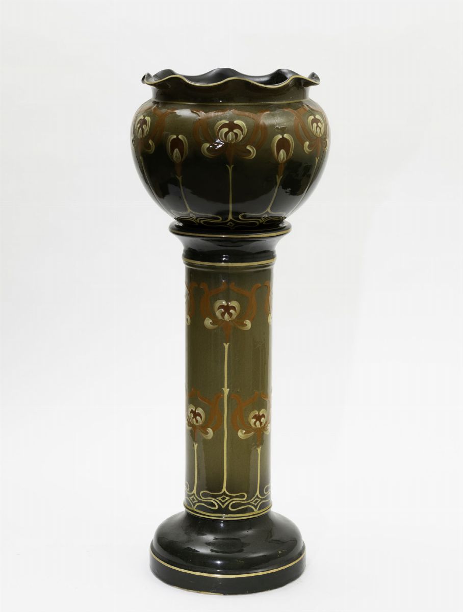Cachepot su colonna in terraglia con decoro policromo.