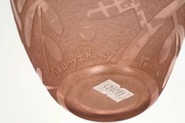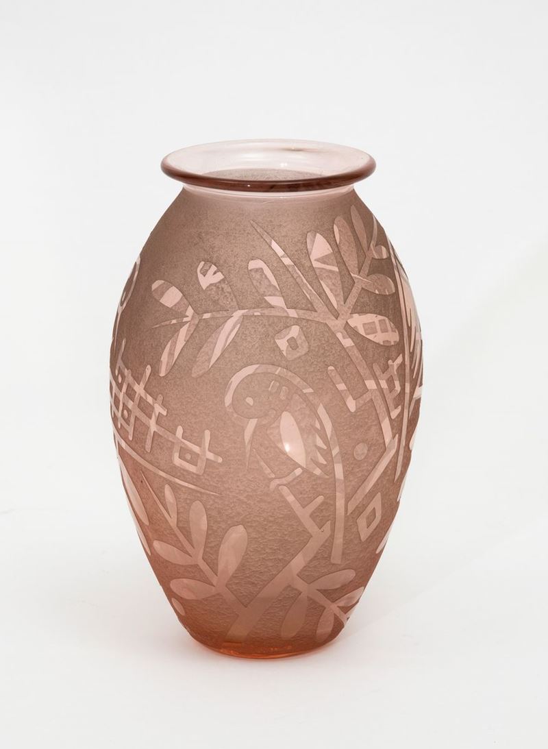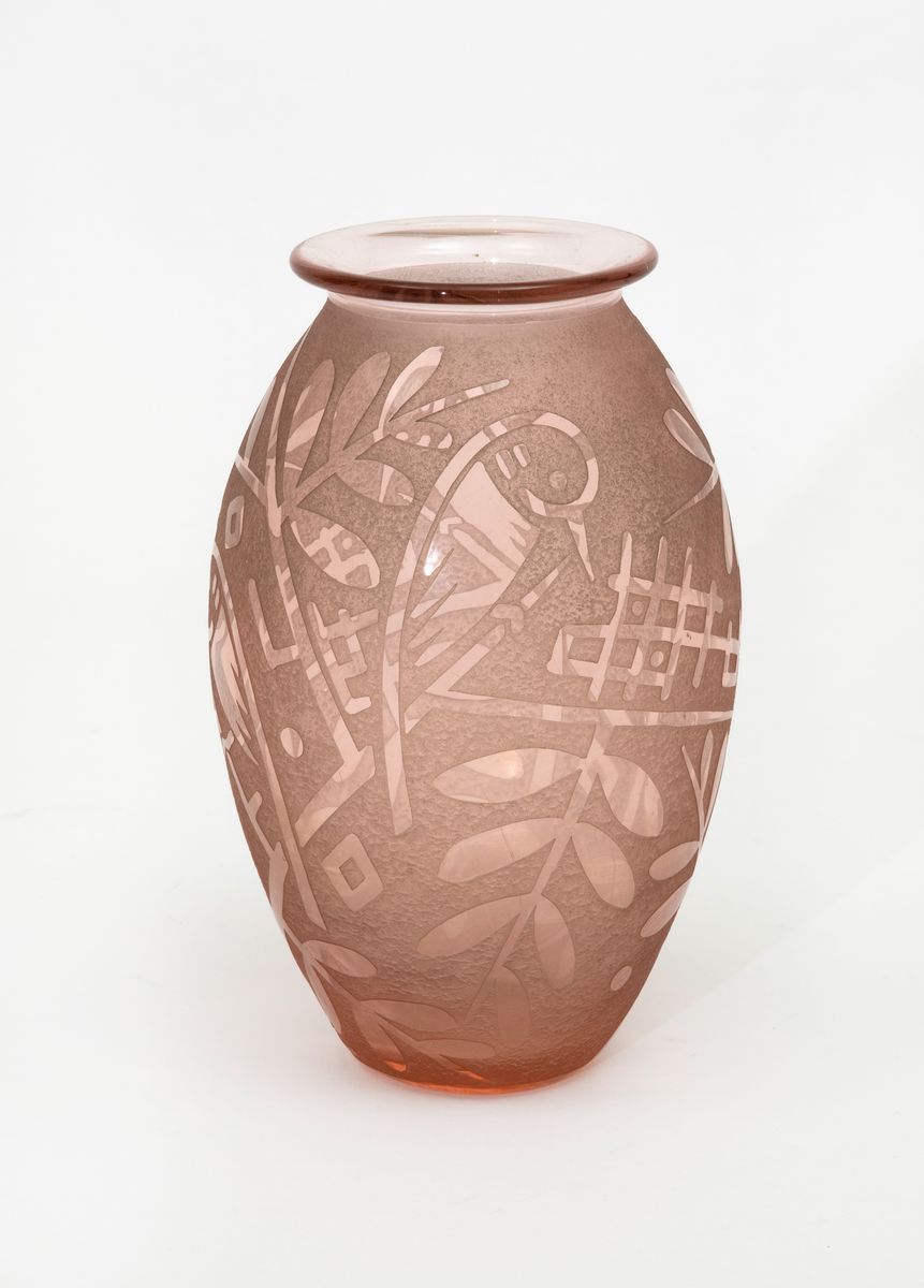 Vaso ovale in vetro soffiato con decoro astratto acidato.