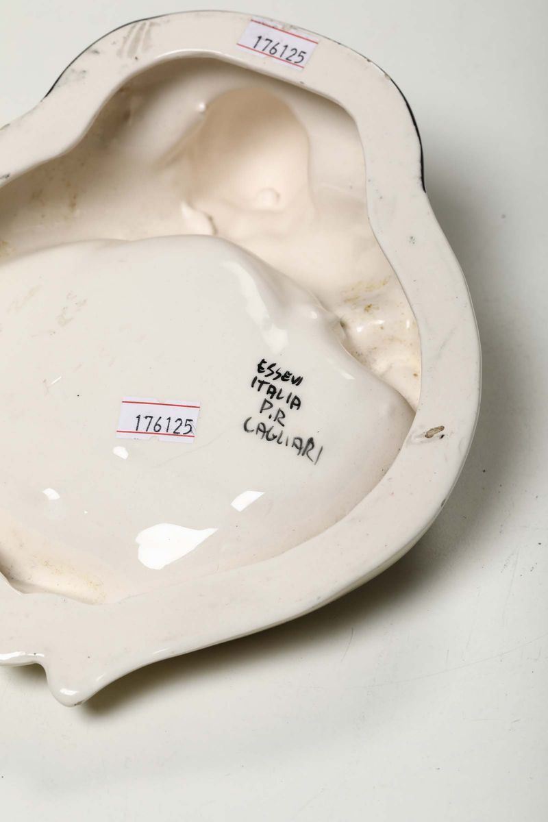 Svuotatasche in ceramica a colaggio con decoro policromo.