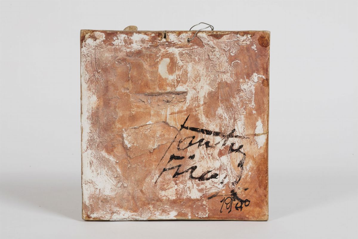 Lotto composto da una piastrella in ceramica raffigurante personaggi e soprammobile con fiori in rilievo.