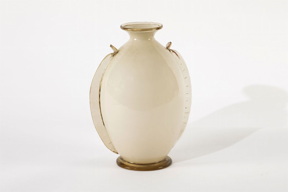 Vaso in vetro incamiciato con anse, bocca e piede applicati, piccola felatura.