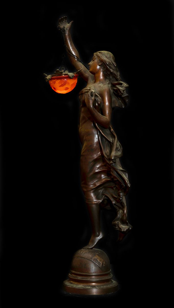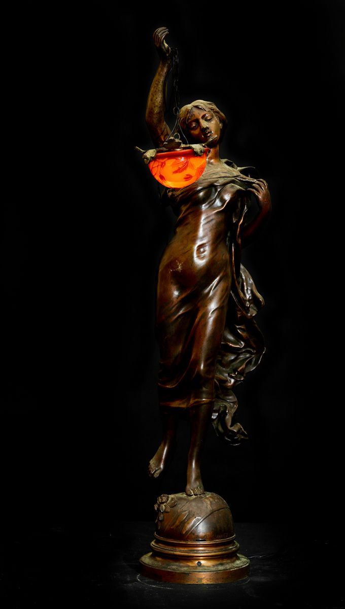 Figura di donna in metallo stampato firmato Gaudez che regge piccola diffusore in vetro a cammeo firmato Gallè.