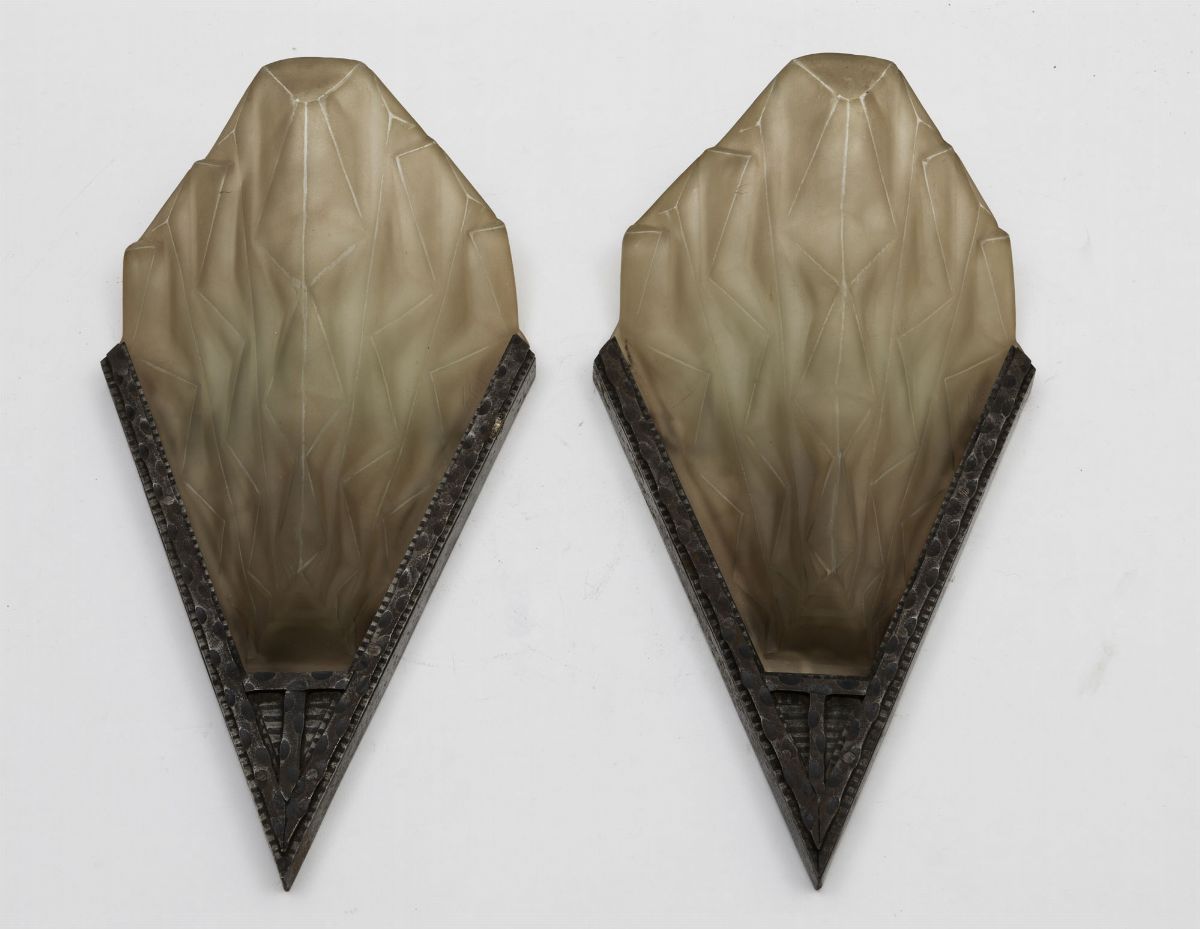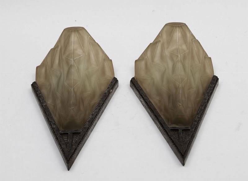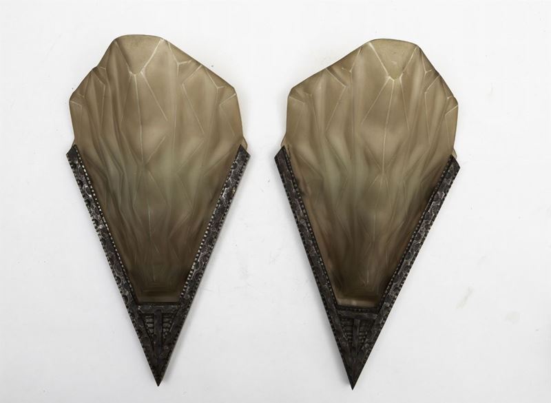 Coppia di appliques a ventaglio in ferro lavorato con diffusori in vetro sabbiato.