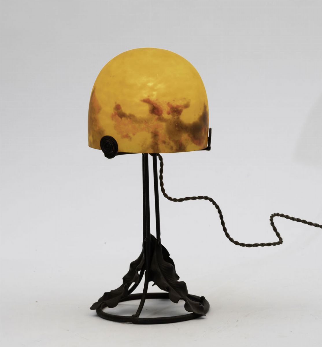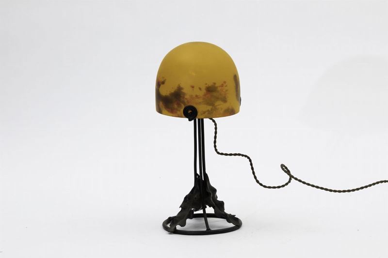 Lampada in ferro lavorato con cappello in pasta vitrea gialla.
