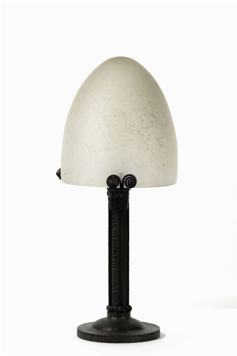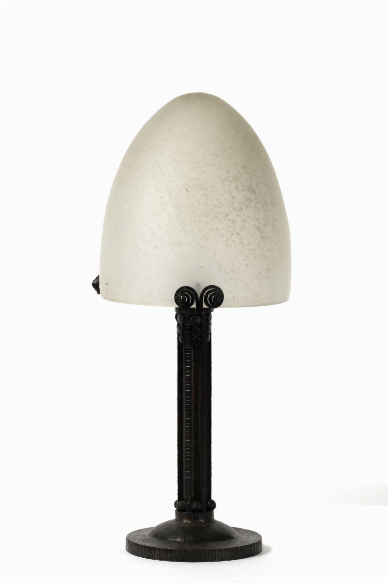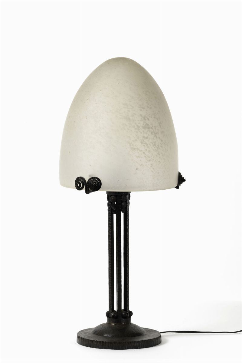 Lampada da tavolo in ferro forgiato con diffusore in pasta vitrea.