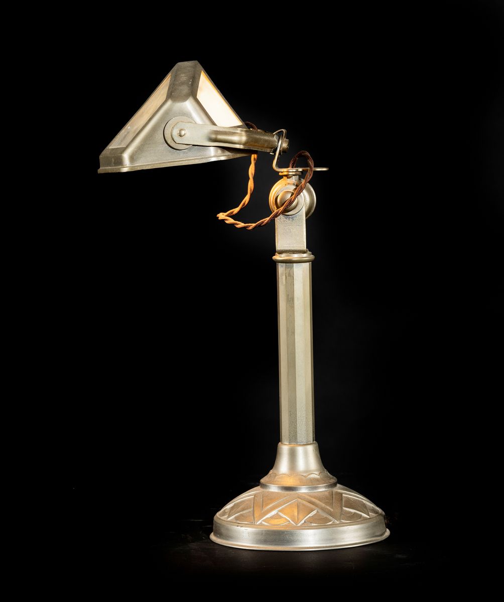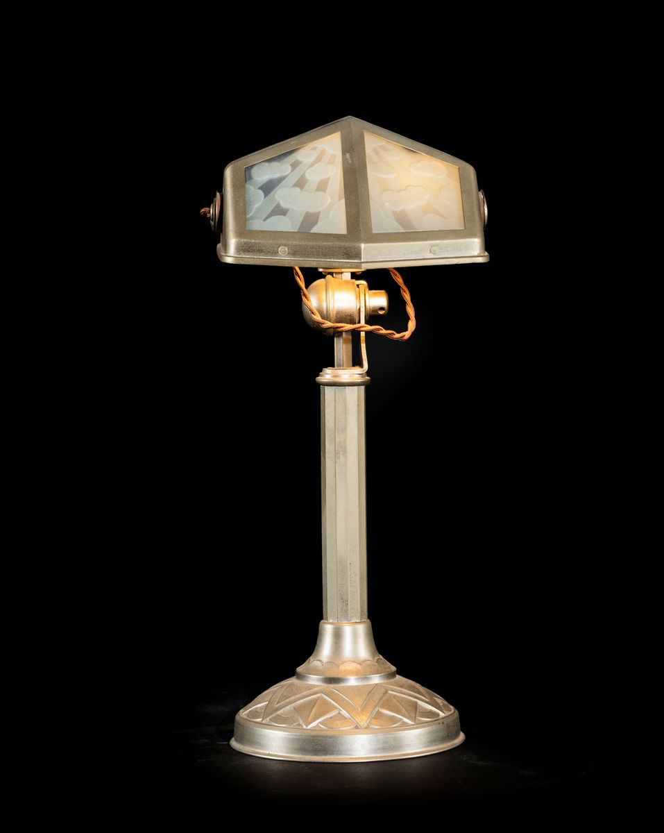 Lampada in metallo argentato con diffusore a placche in biscuit serigrafato.
