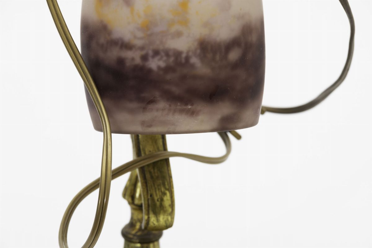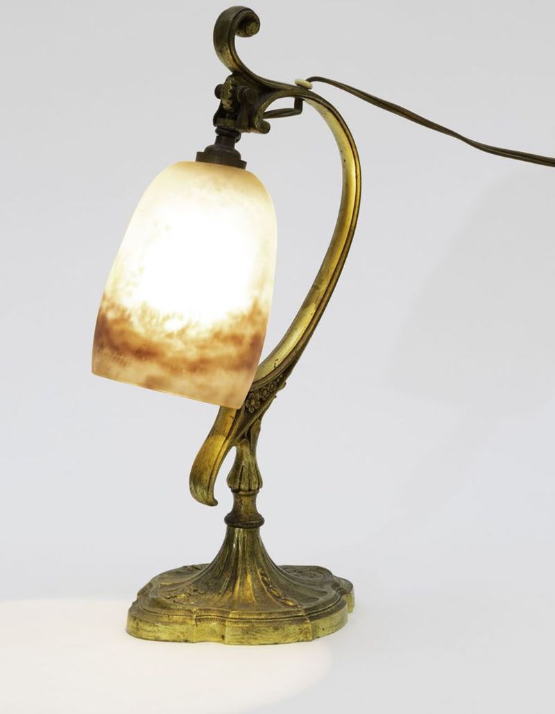 Lampada da tavolo in ottone con diffusore in pasta vitrea.