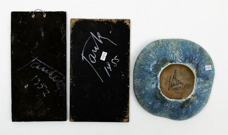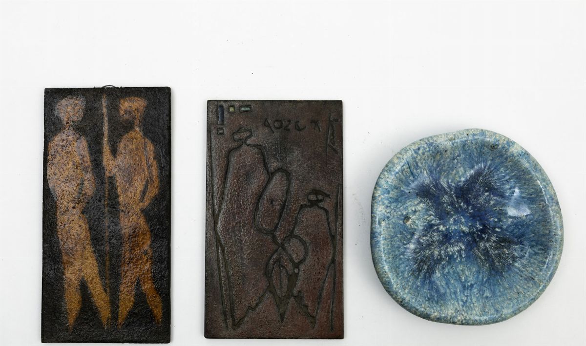 Lotto composto da piattini e due piastrelle in maiolica decorate.