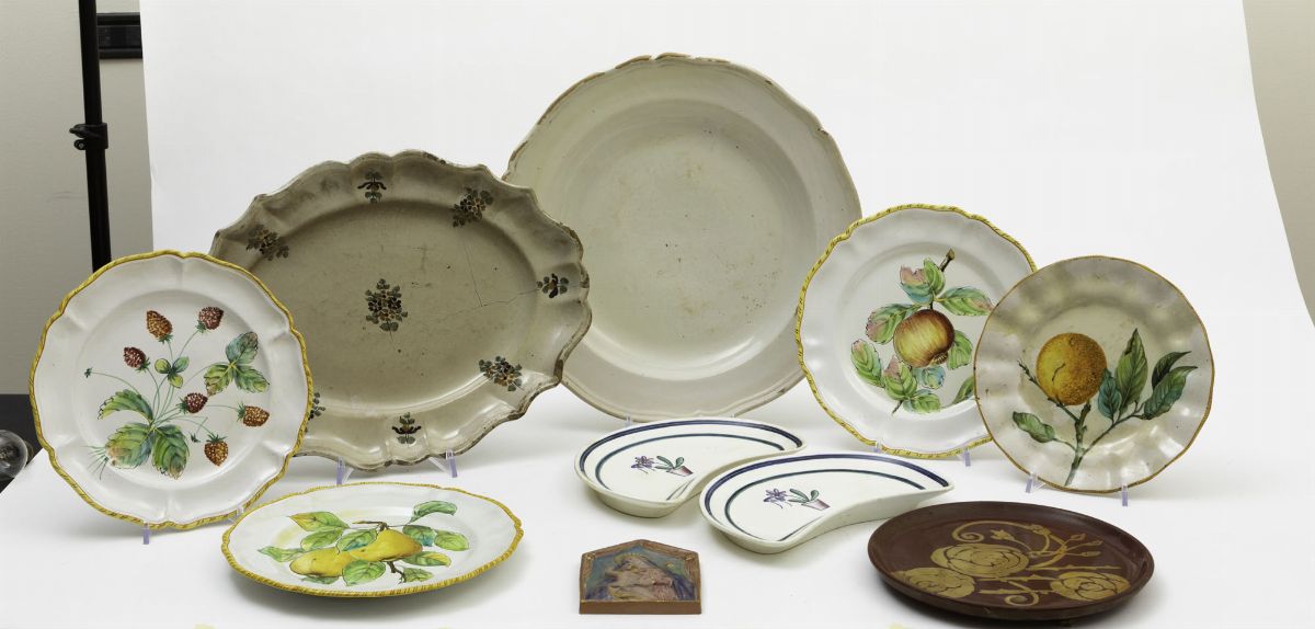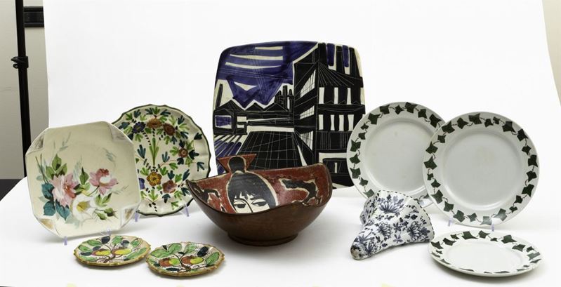 Lotto composto da trentatre piatti diversi e decorazioni in ceramica.