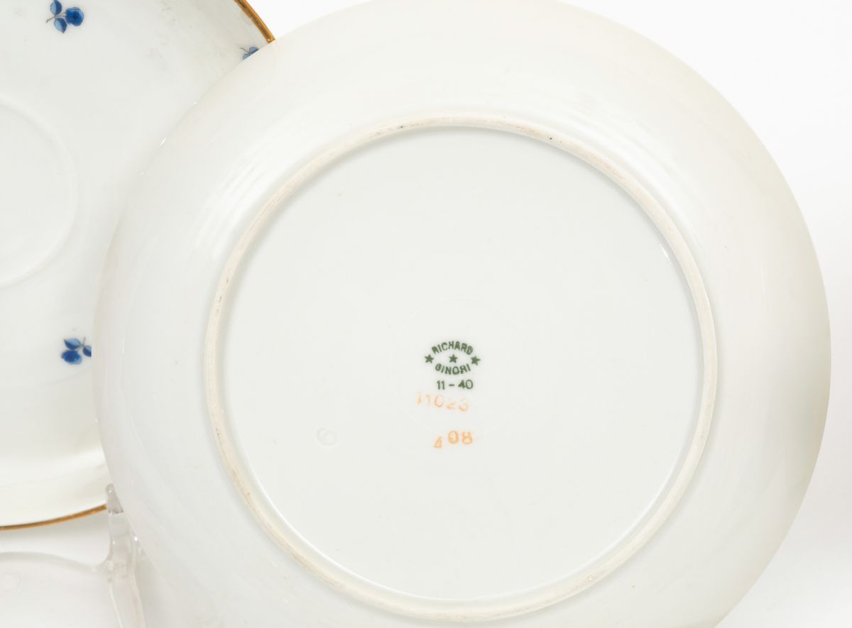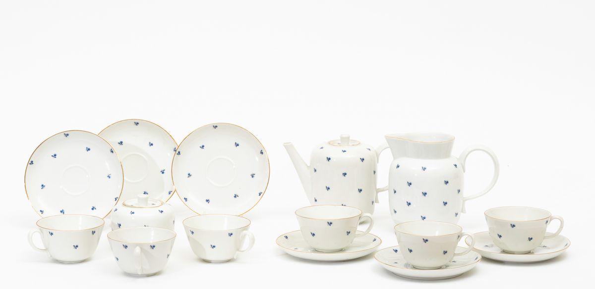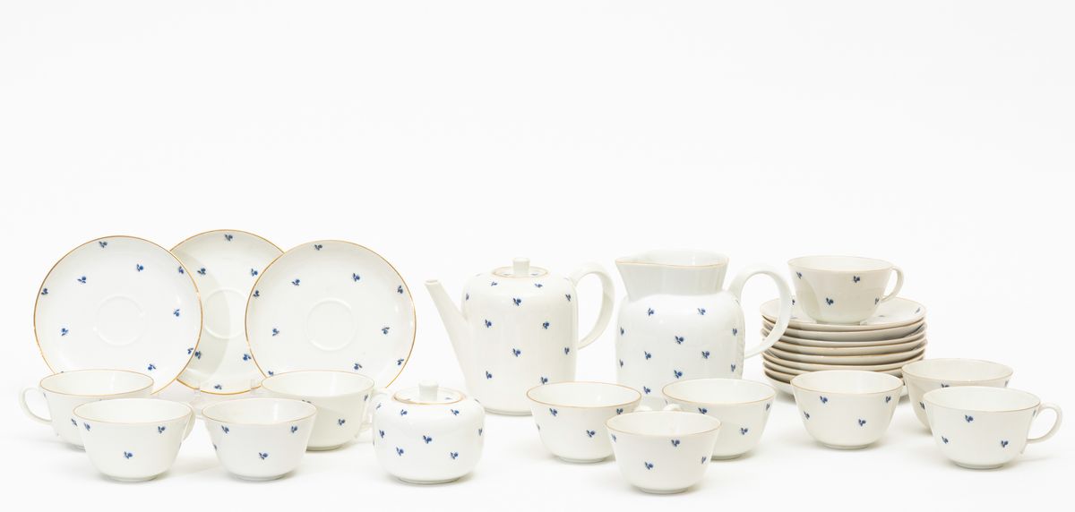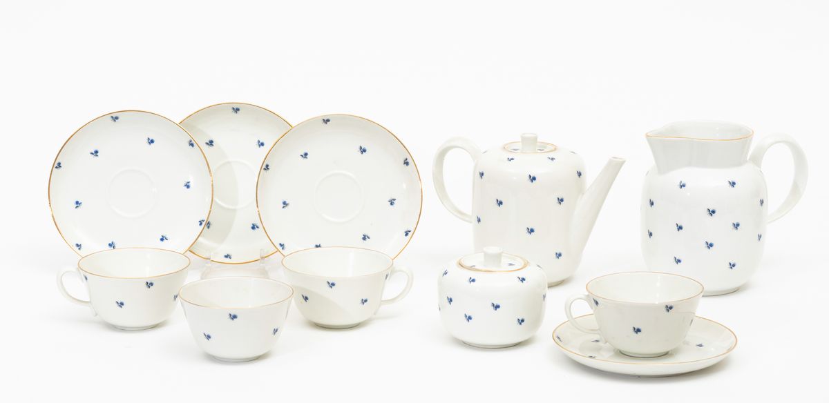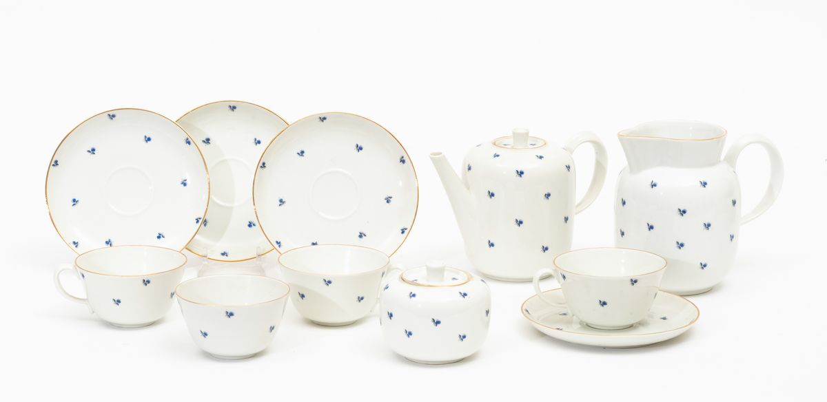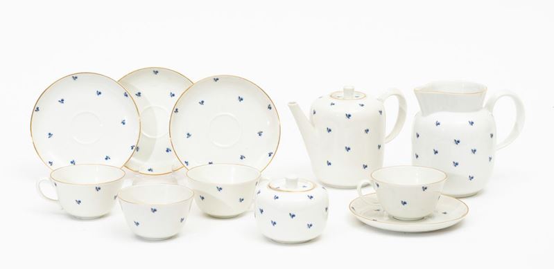 Servizio da caffellatte formato da caffettiera, lattiera, zuccheriera, undici tazzine e dodici piattini in porcellana.