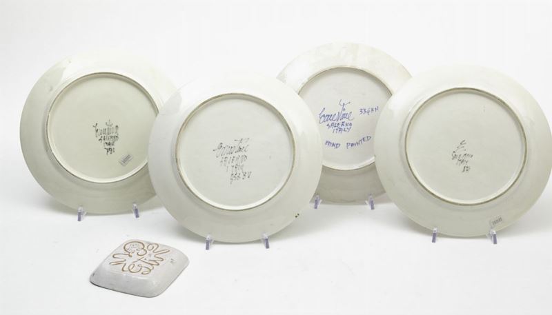 Quattro piatti tondi e uno quadrato in maiolica con decori floreali.
