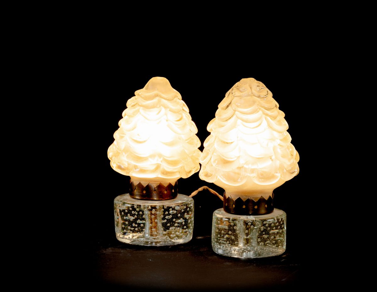 Coppia di lampade da comodino con diffusori in vetro sabbiato e basamenti in vetro pesante con decoro di bollicine sommerse.