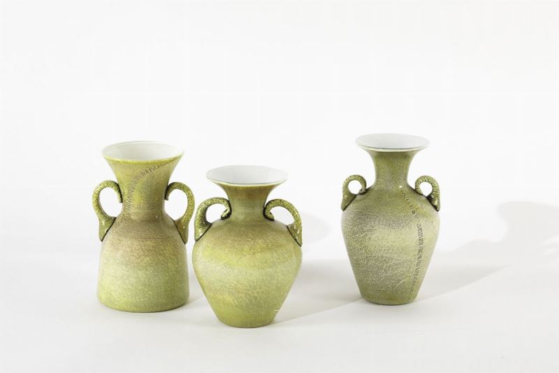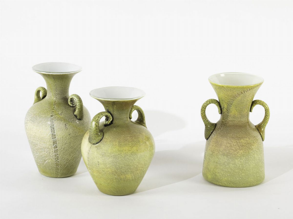 Lotto di tre vasi ad anfora con anse in vetro lattimo incamiciato dorato a foglia d’argento ossidata.