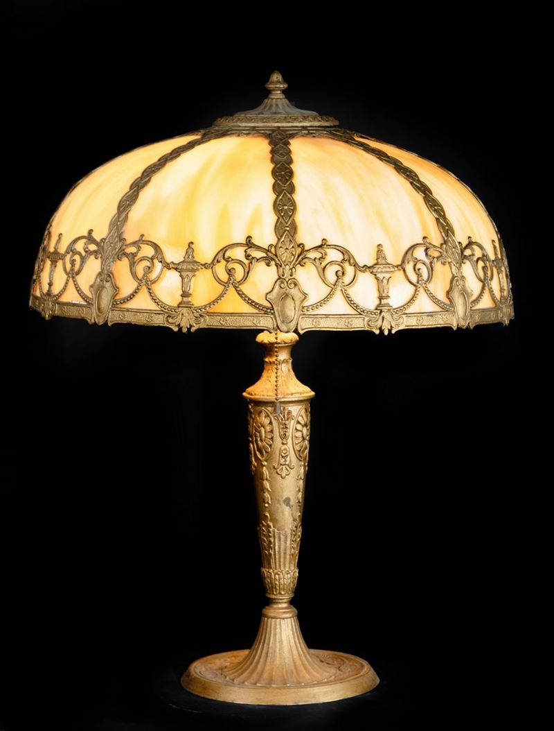 Lampada da tavolo in metallo dorato con cappello a ombrello in vetro calcedonio.