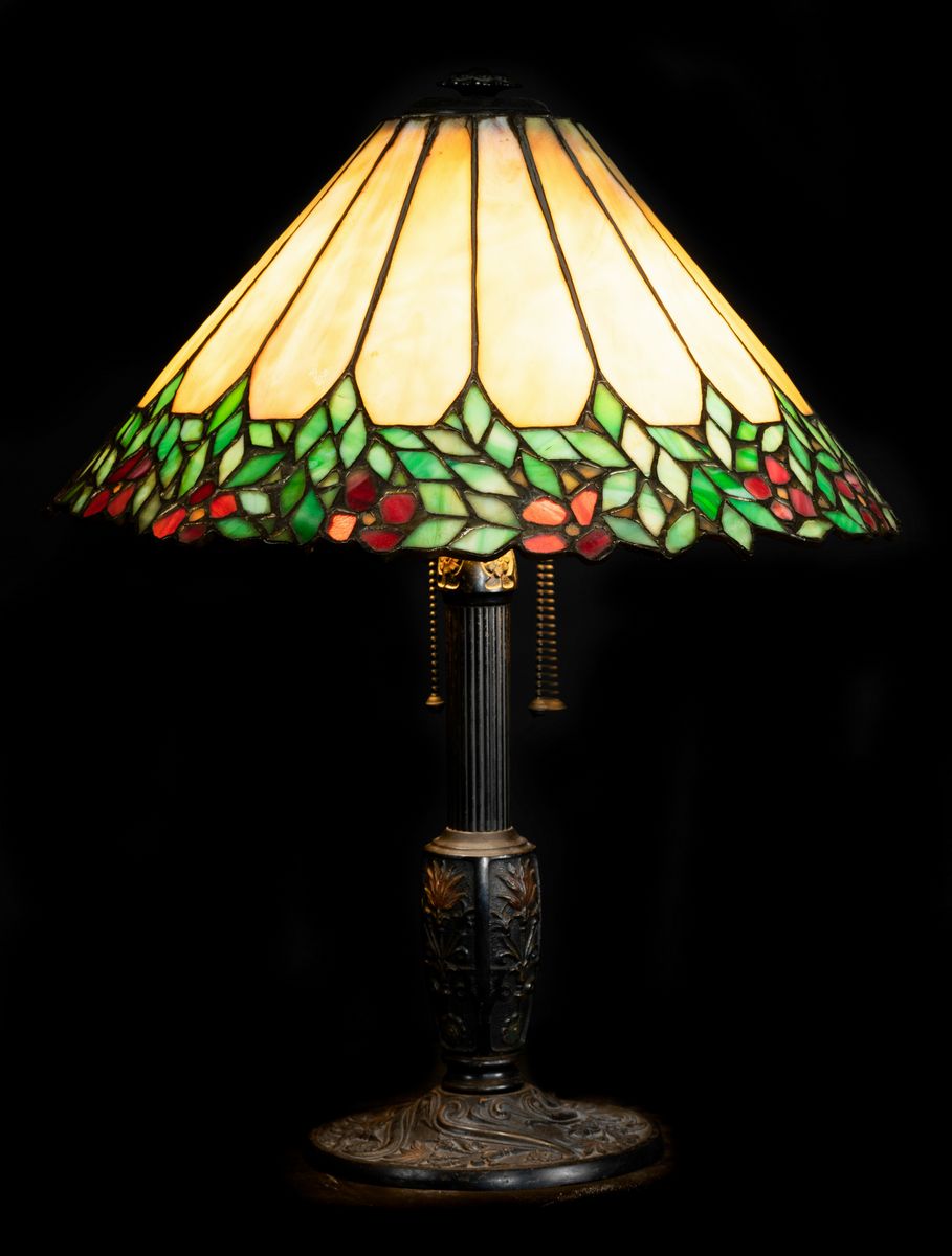 Lampada in metallo stampato con cappello decorato con inserti in pasta vitrea piombati.