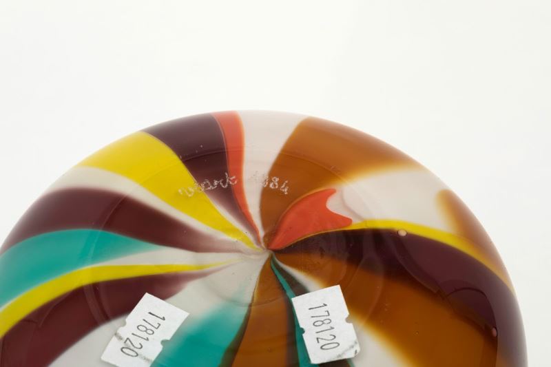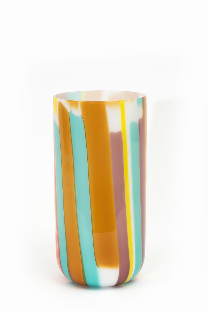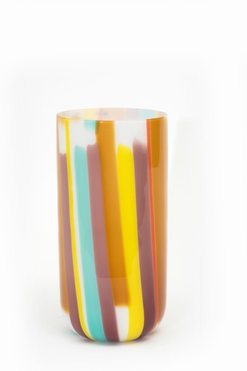 Vaso cilindrico in vetro soffiato con decoro di canne policrome.