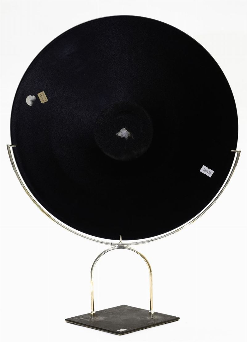 Piatto in vetro opaco con decoro di grandi murrine multicolori. Superficie interamente acidata. Venduto con reggipiatto in metallo cromato e ferro.