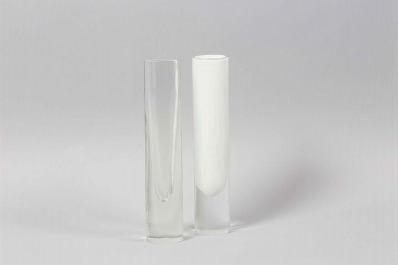 Coppia di vasi cilindrici in vetro soffiato sommerso, uno cristallo e l'altro lattimo.