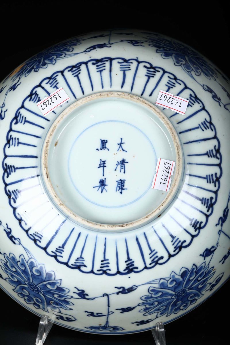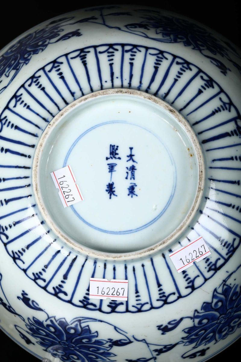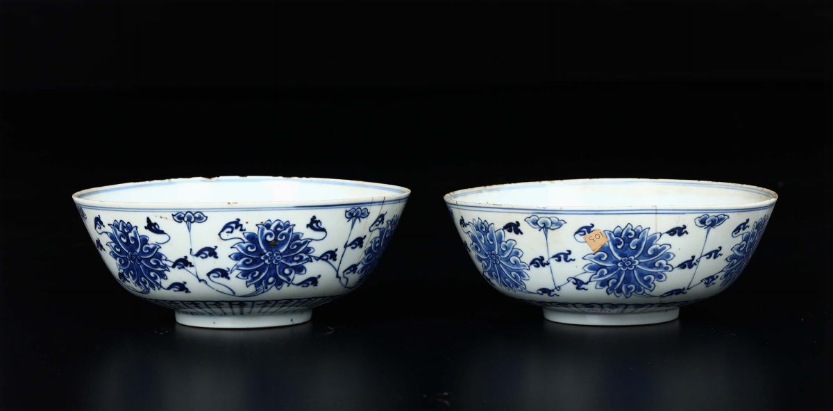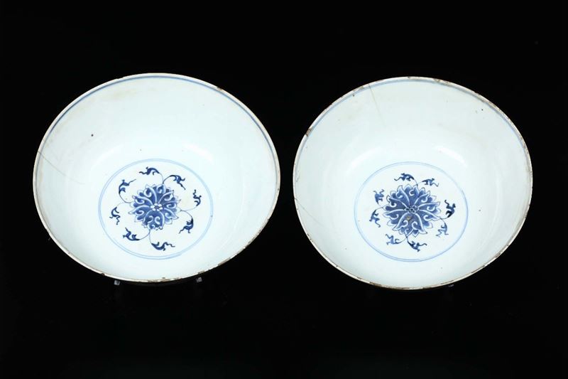 Coppia di ciotole in porcellana bianca e blu a decoro floreale, Cina, Dinastia Qing, XIX secolo