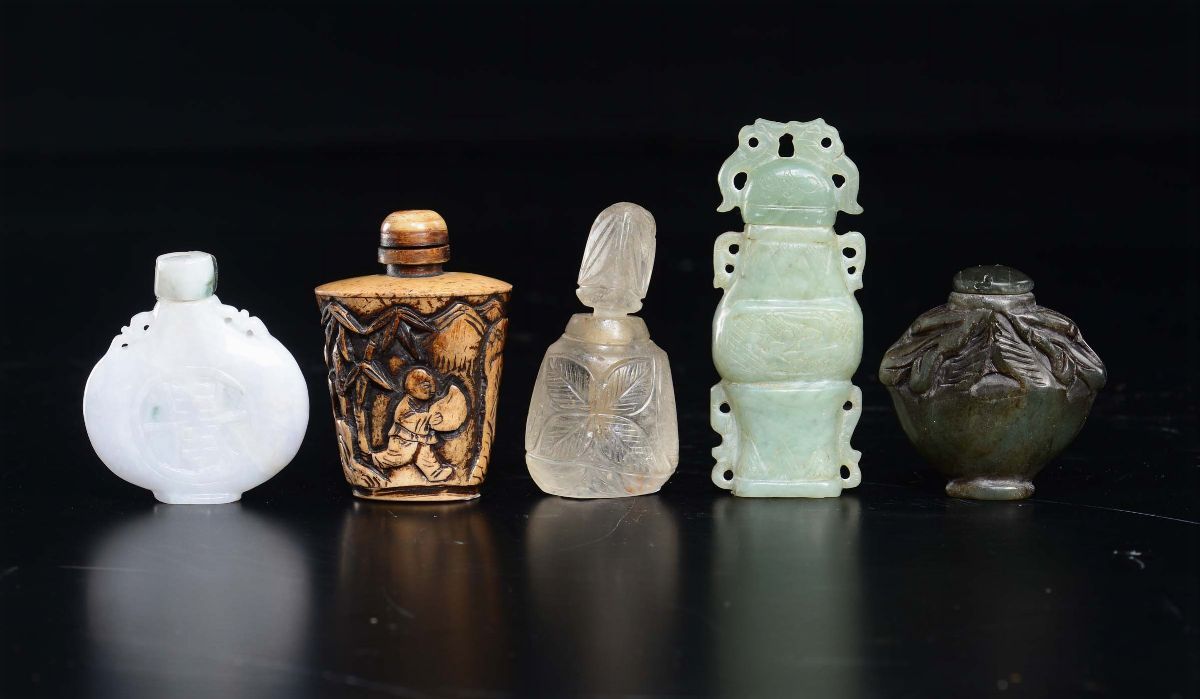 Lotto di sei snuff bottles in materiali diversi, pietra dura, osso, giada verde, vetro, giadeite, Cina, Dinastia Qing, XIX secolo