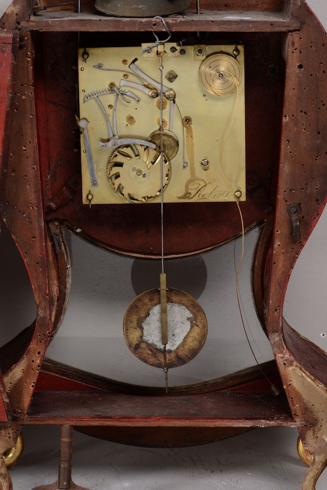 decori fitoformi, lumeggiature in oro, quadrante smaltato con numeri romani per le ore e arabi per i minuti, altezza cm 67