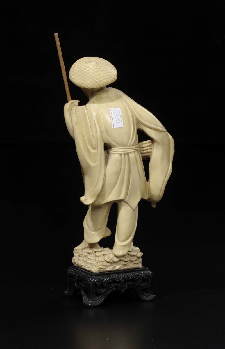 Pescatore in simil avorio con bastone e cestino pieno di pesci, Giappone, inizio XX secolo