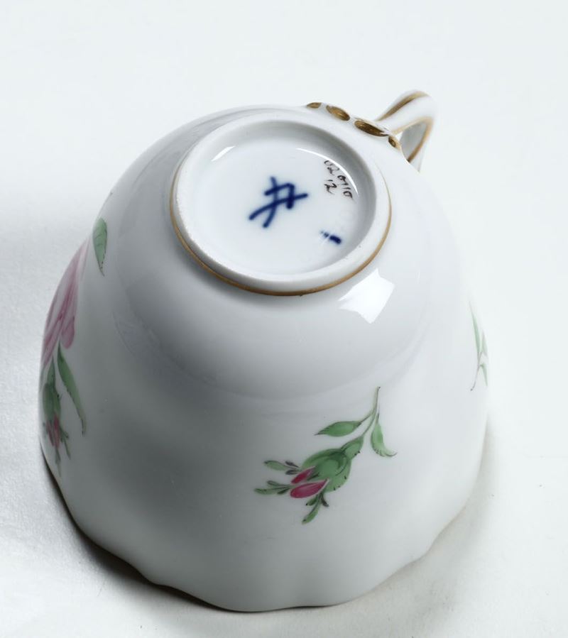 Quattro tazzine con piattino in porcellana Meissen, prima metà del XX secolo Decorazione policroma alla rosa