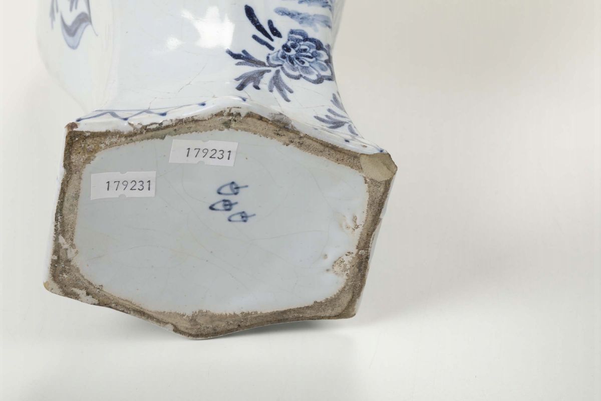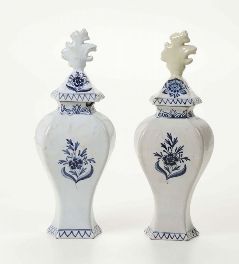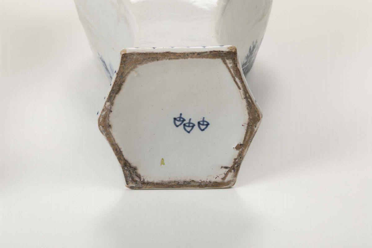 Maiolica. Marca: sotto le potiches le “tre campane” della fabbrica De Drye Clocken; sotto i vasi le lettere “AL” legate in blu. Altezza cm 41 e cm 49. Potiches con rotture e restauri ai bordi superiori, un coperchio con vecchio restauro; i vasi restaurati entrambi al bordo superiore
