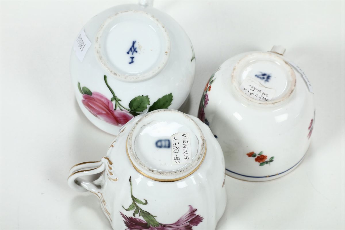 Tre tazze in porcellana senza piattino (Vienna XVIII- Meissen inizio XIX- Napoli? XVIII) e un cucchiaio in porcellana Meissen XX secolo