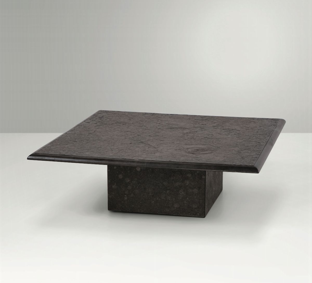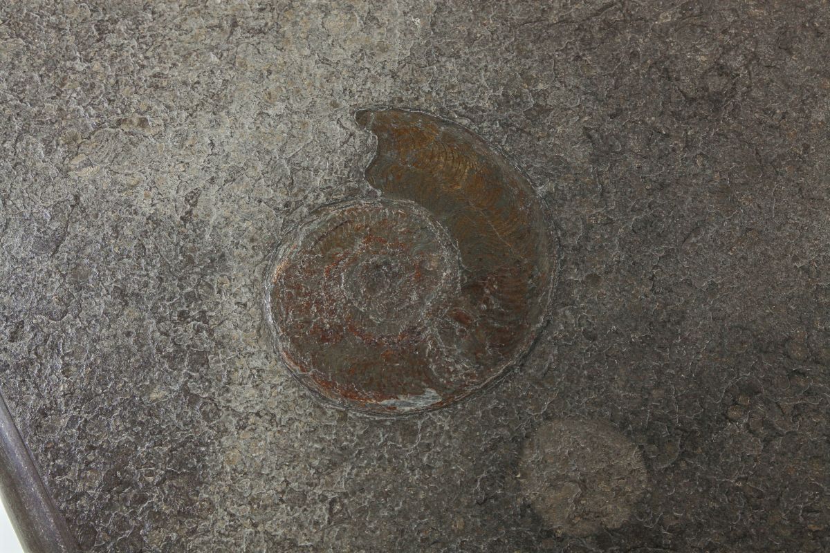 Tavolo basso con struttura in legno e piano in pietra fossile Swabian oil Shale con bordi molati. Etichetta originale.