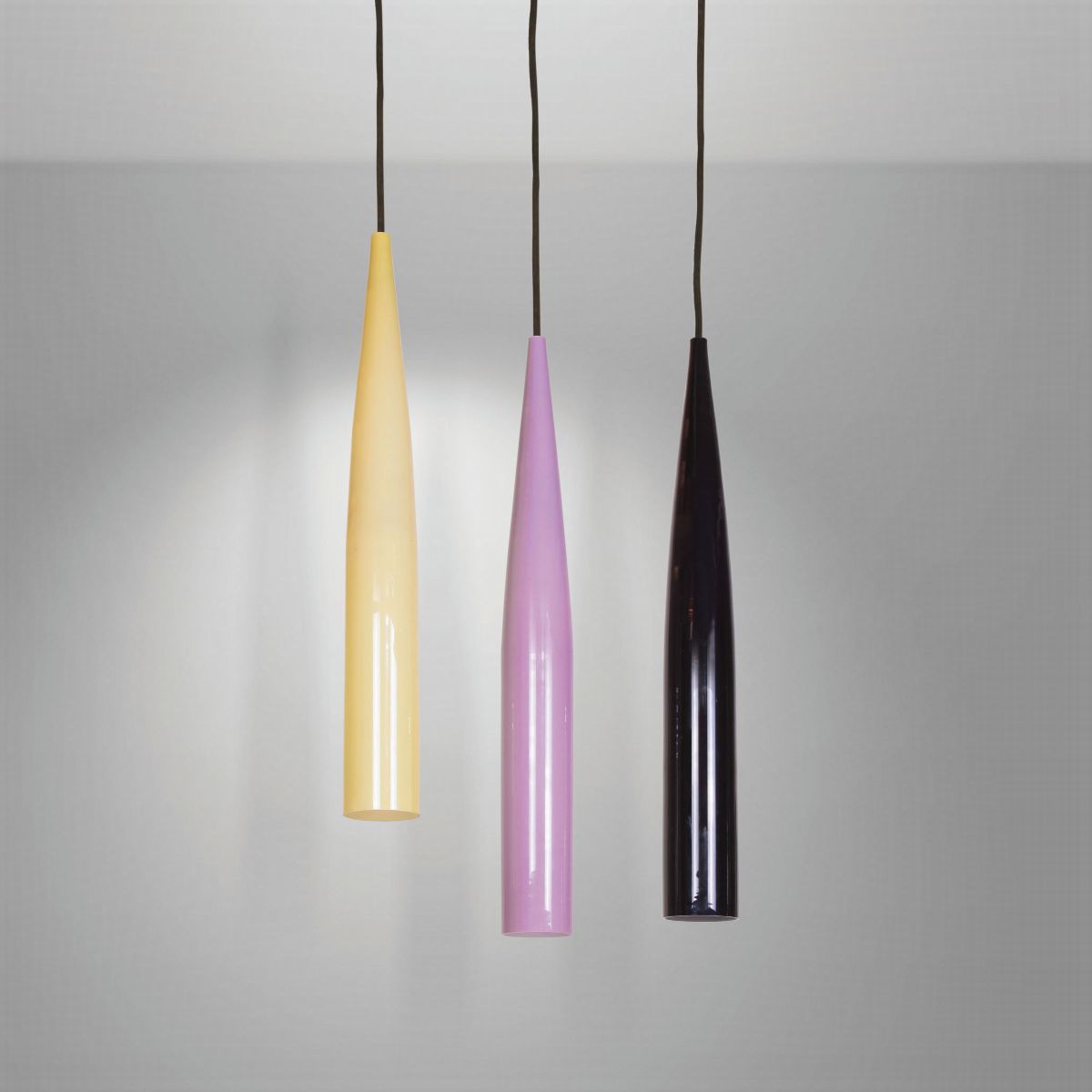 Gruppo di tre sospensioni con diffusore in vetro incamiciato.