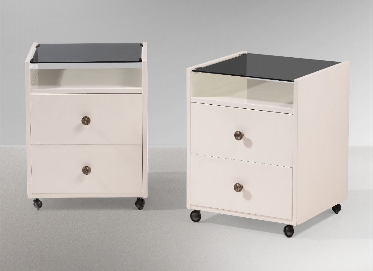 Coppia di comodini con struttura in legno laccato, piano in vetro e dettagli in metallo.