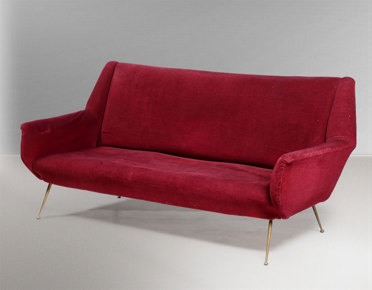 Divano con struttura in legno e ottone. Rivestimenti in tessuto.