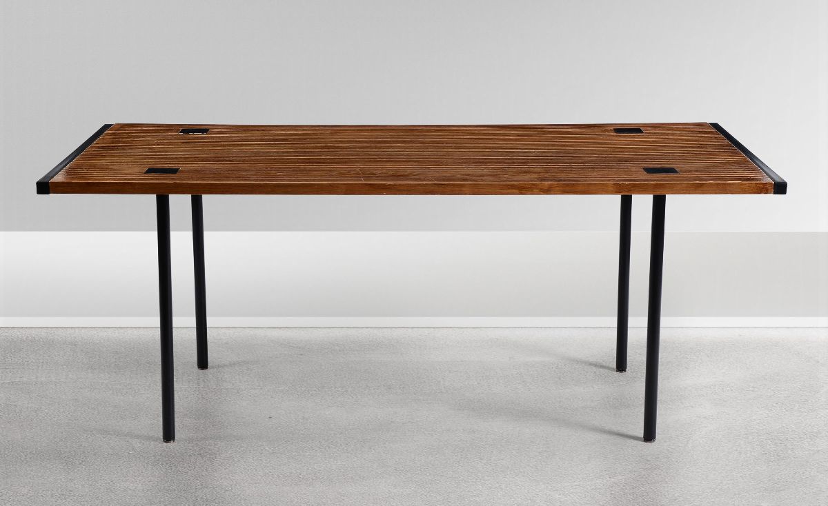 Raro tavolo con struttura in metallo laccato e borchie fuse in bronzo per il fissaggio delle gambe, piano a doghe in legno.