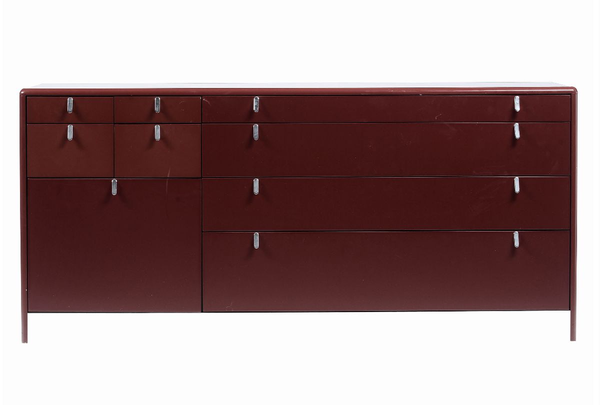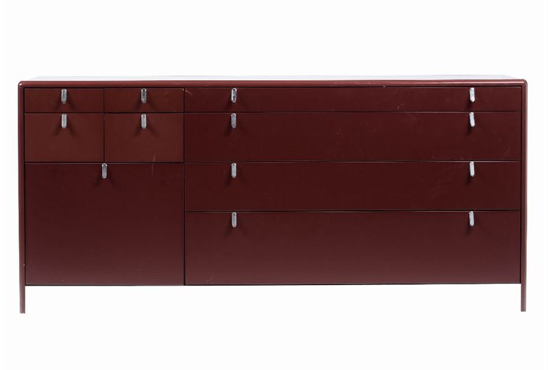 Cassettiera da camera con struttura in legno laccato e dettagli in metallo.