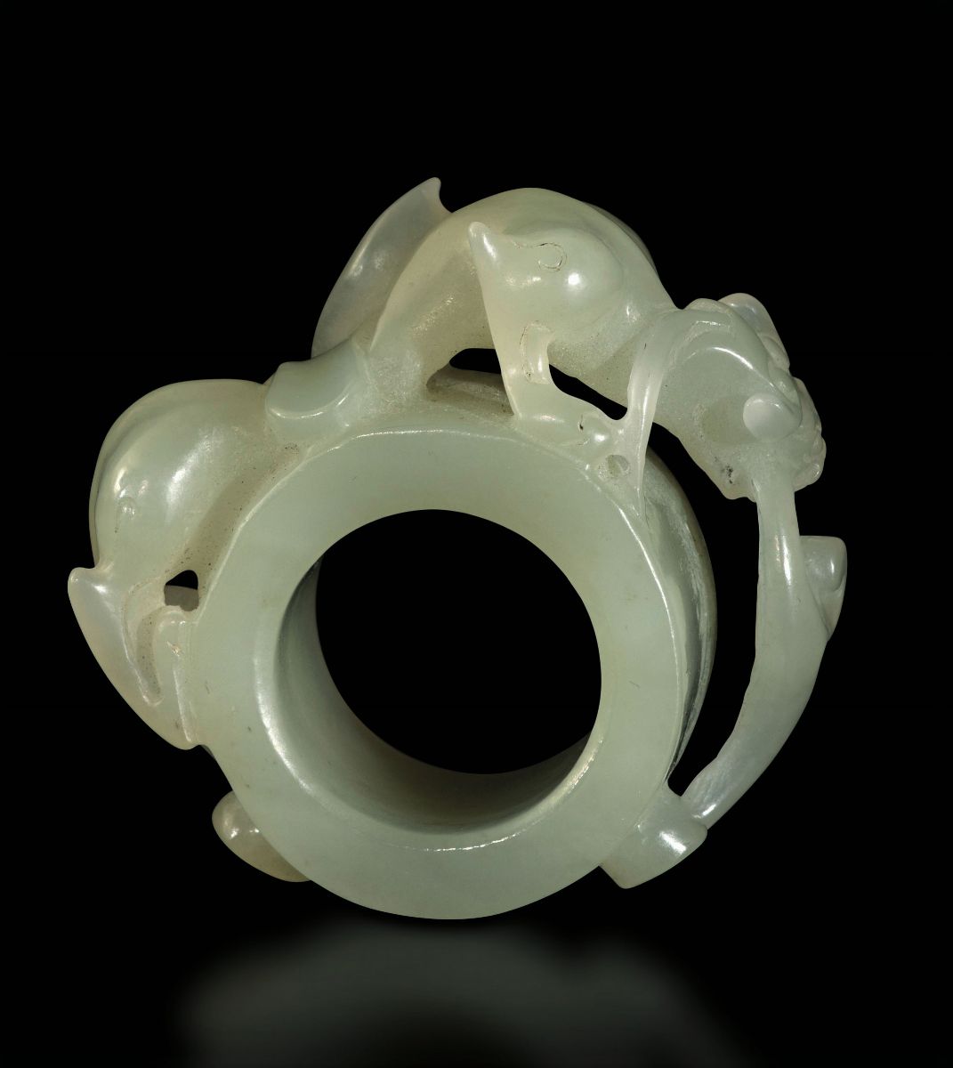 Anello da arciere in giada celadon con figura di draghetto a rilievo, Cina, Dinastia Qing, epoca Qianlong (1736-1796)