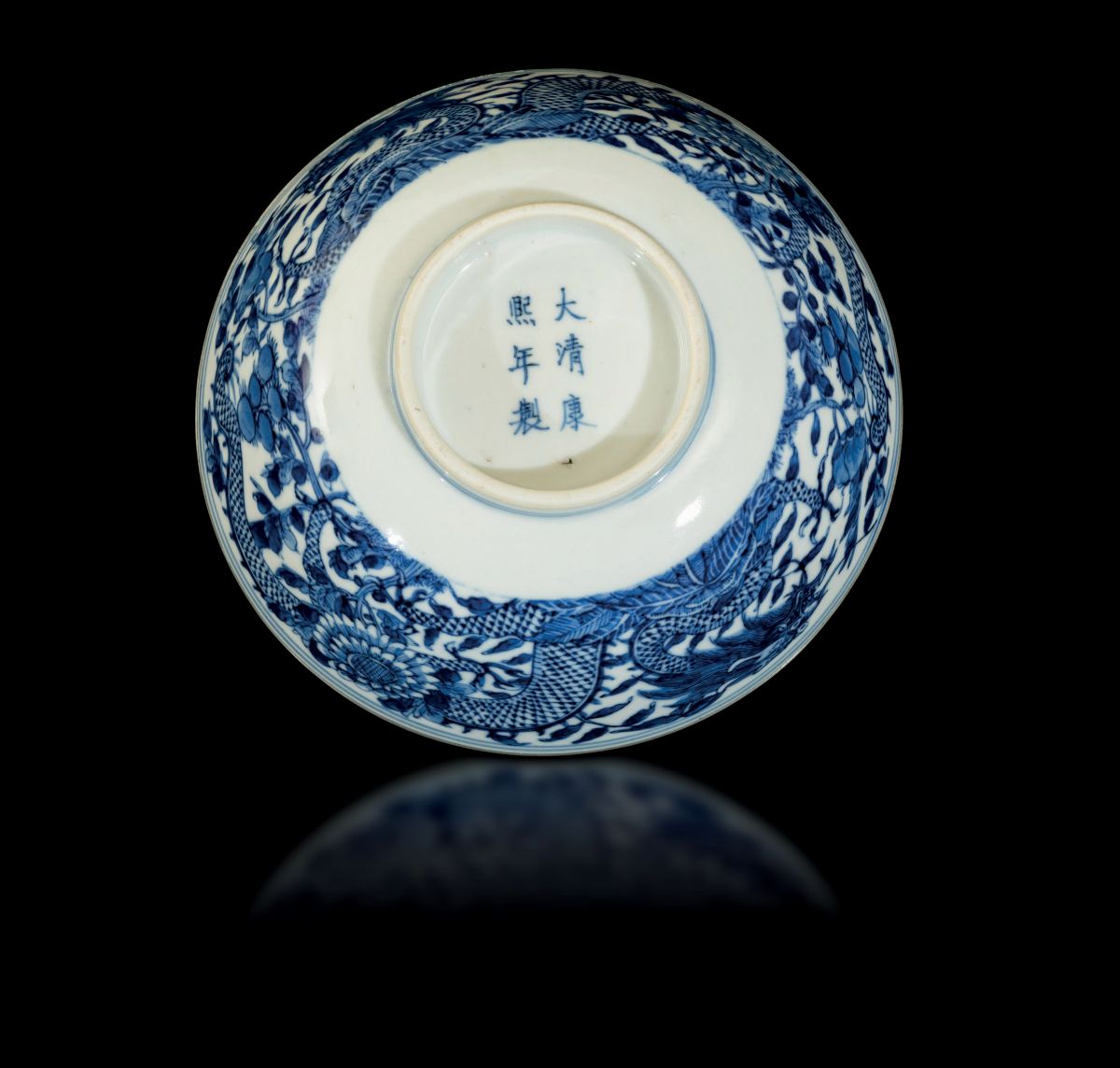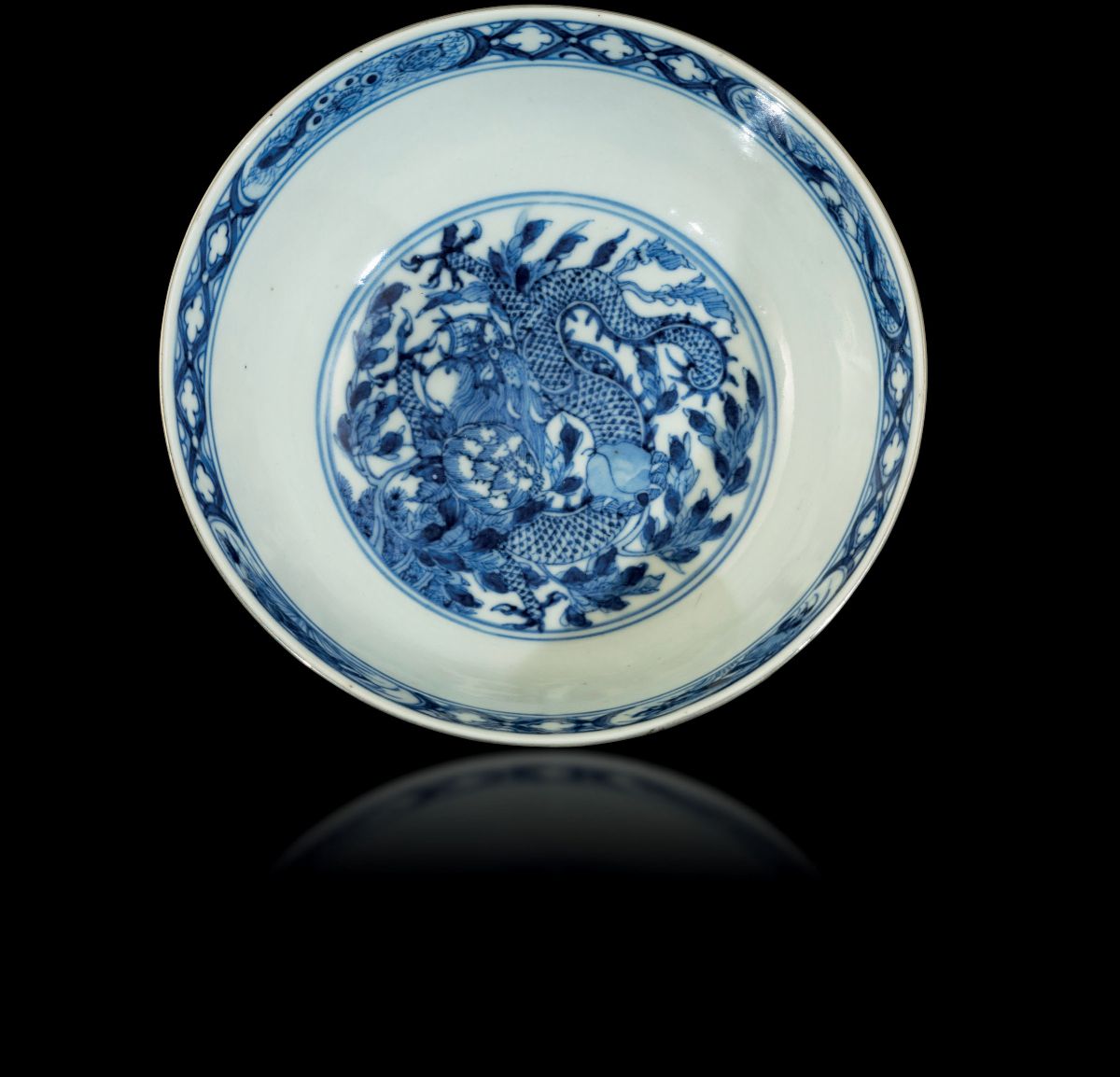 Bowl in porcellana bianca e blu con figure di draghi e decori floreali, Cina, Dinastia Qing, epoca Guangxu (1875-1908)