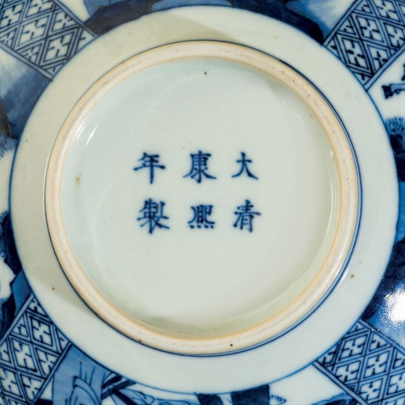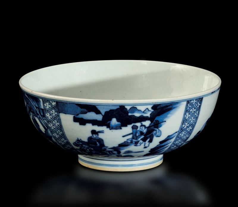Bowl in porcellana bianca e blu con raffigurazioni di scene di vita comune entro riserve, Cina, Dinastia Qing, XIX secolo [..]