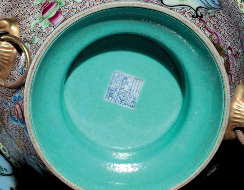 Coppa in porcellana a smalti policromi con coperchio, anse ad anello con mascheroni a foggia di cani di Pho e raffigurazioni naturalistiche entro riserve, Cina, XX secolo