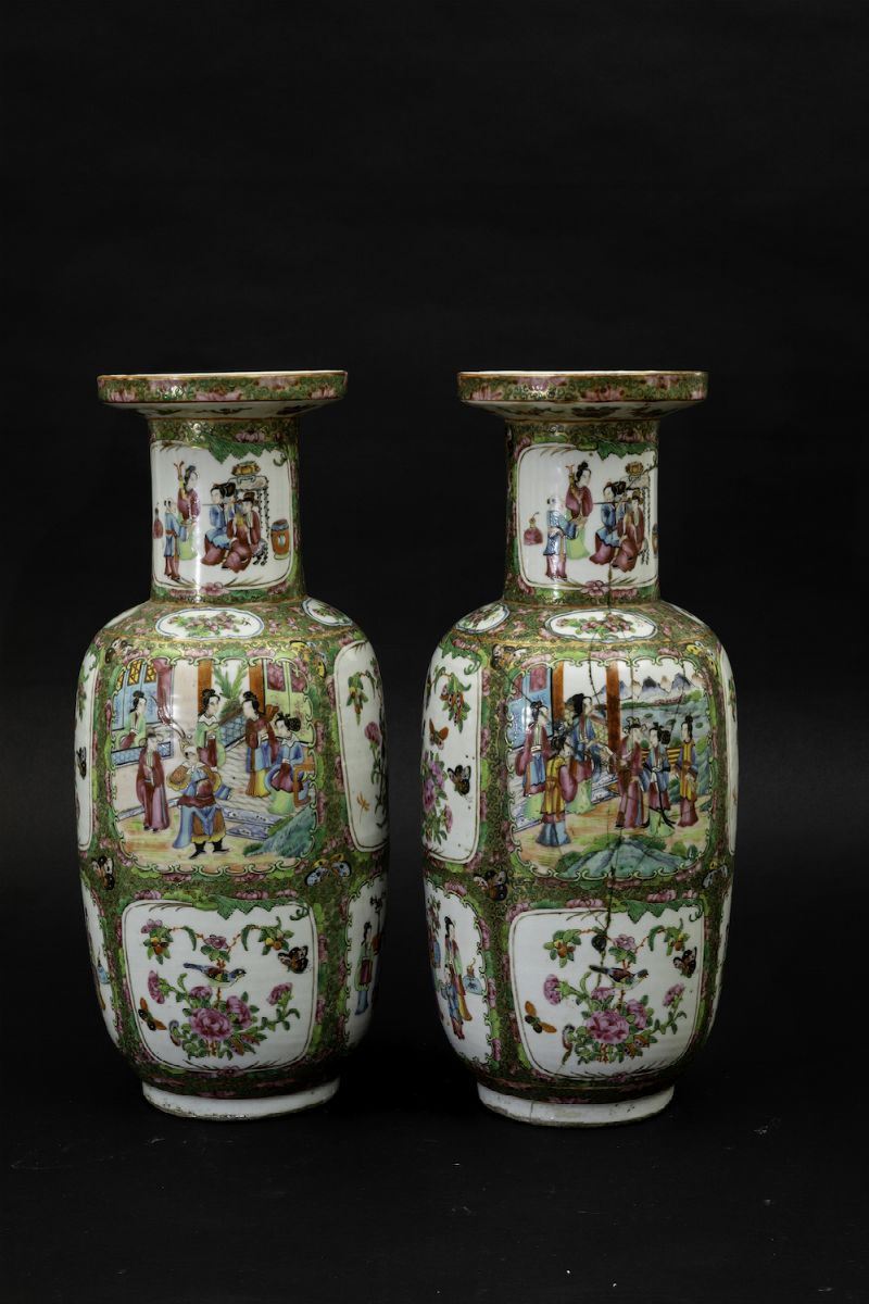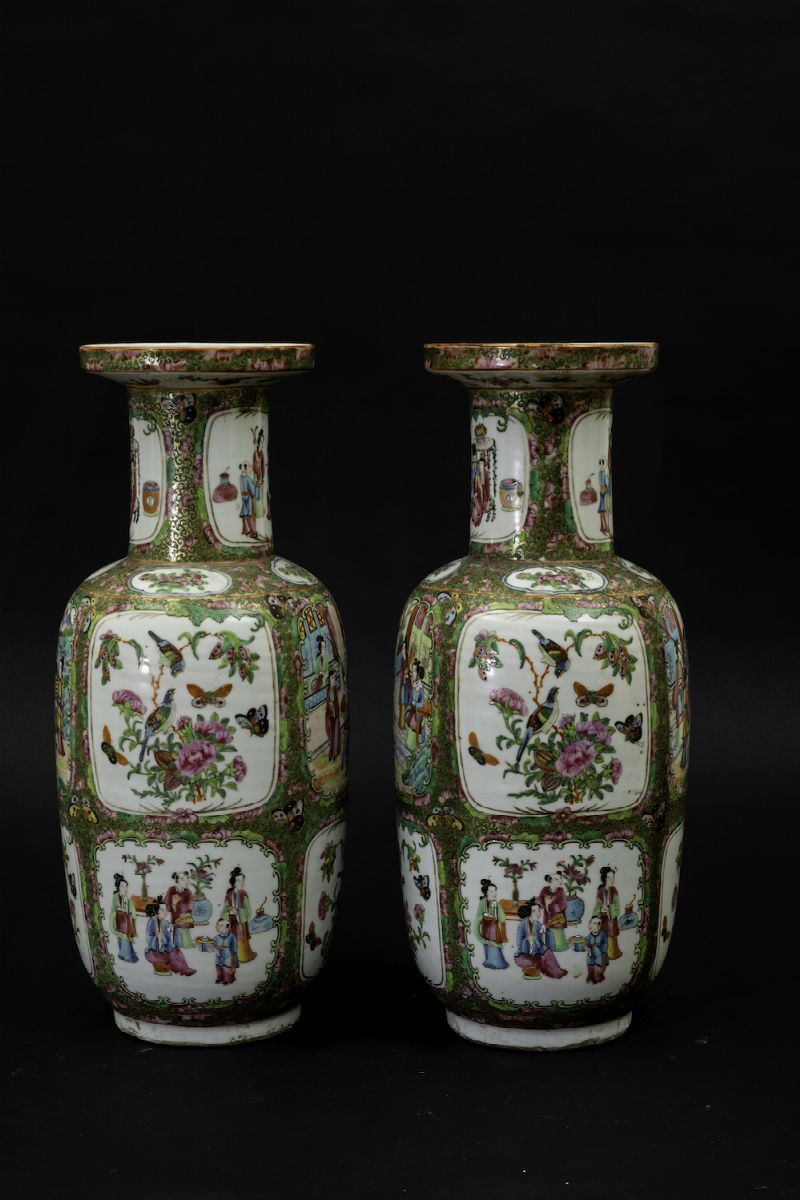 Coppia di vasi in porcellana Canton con scene di vita comune e raffigurazioni naturalistiche entro riserve, Cina, Dinastia [..]