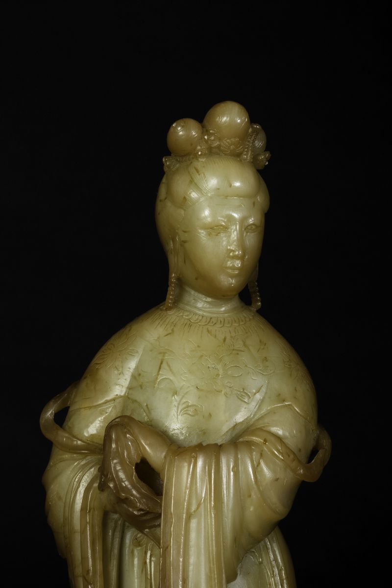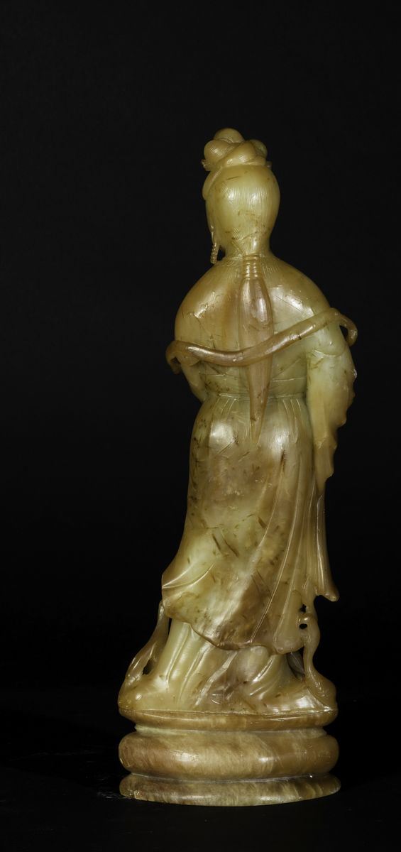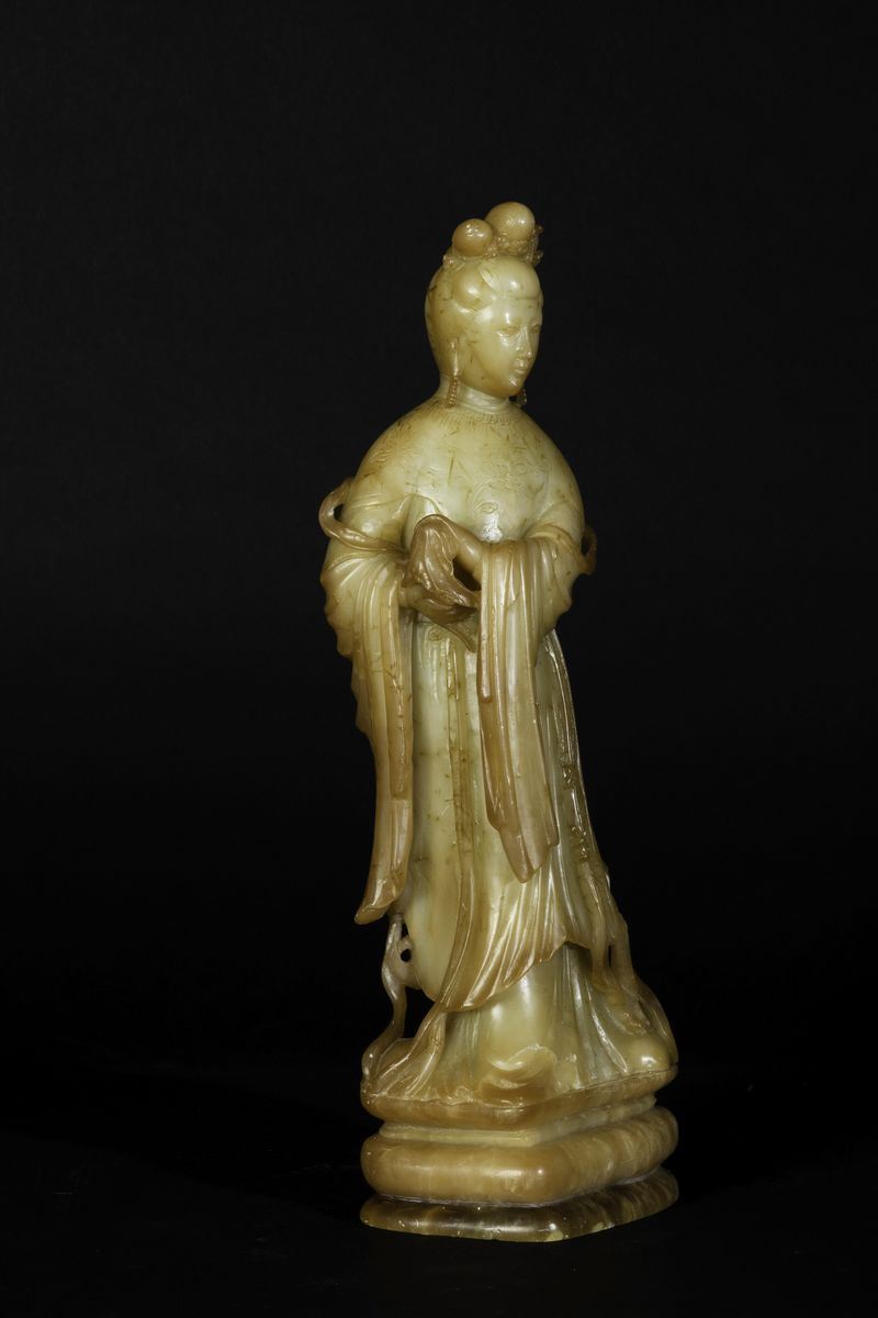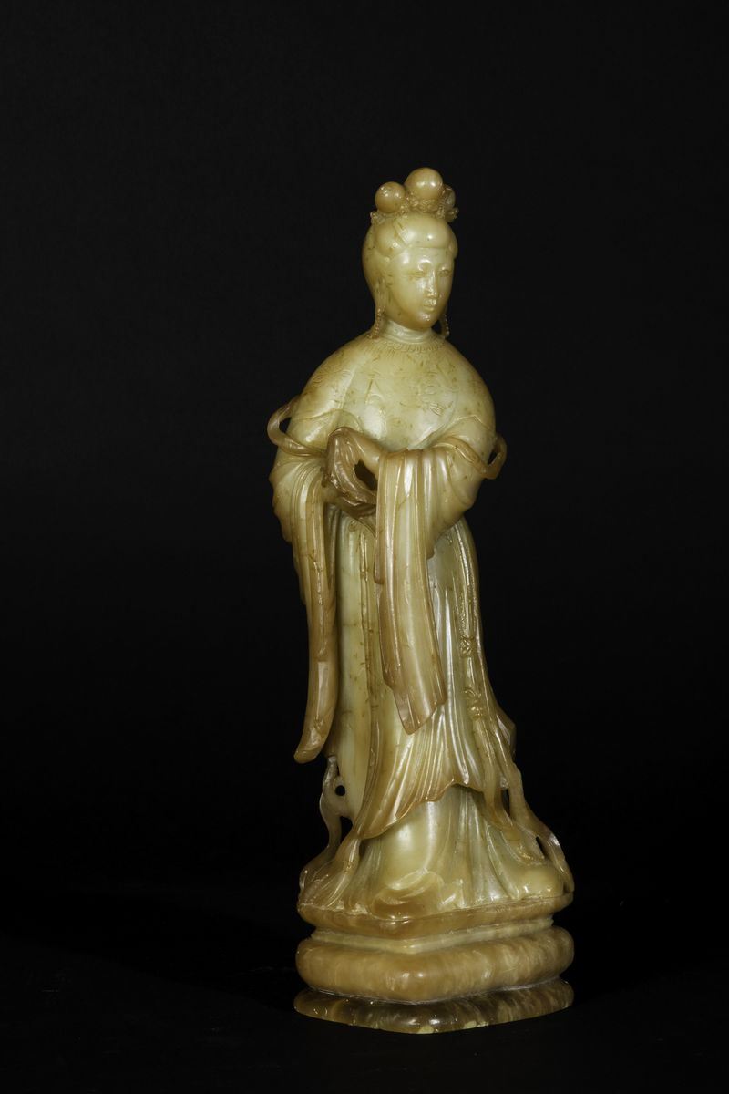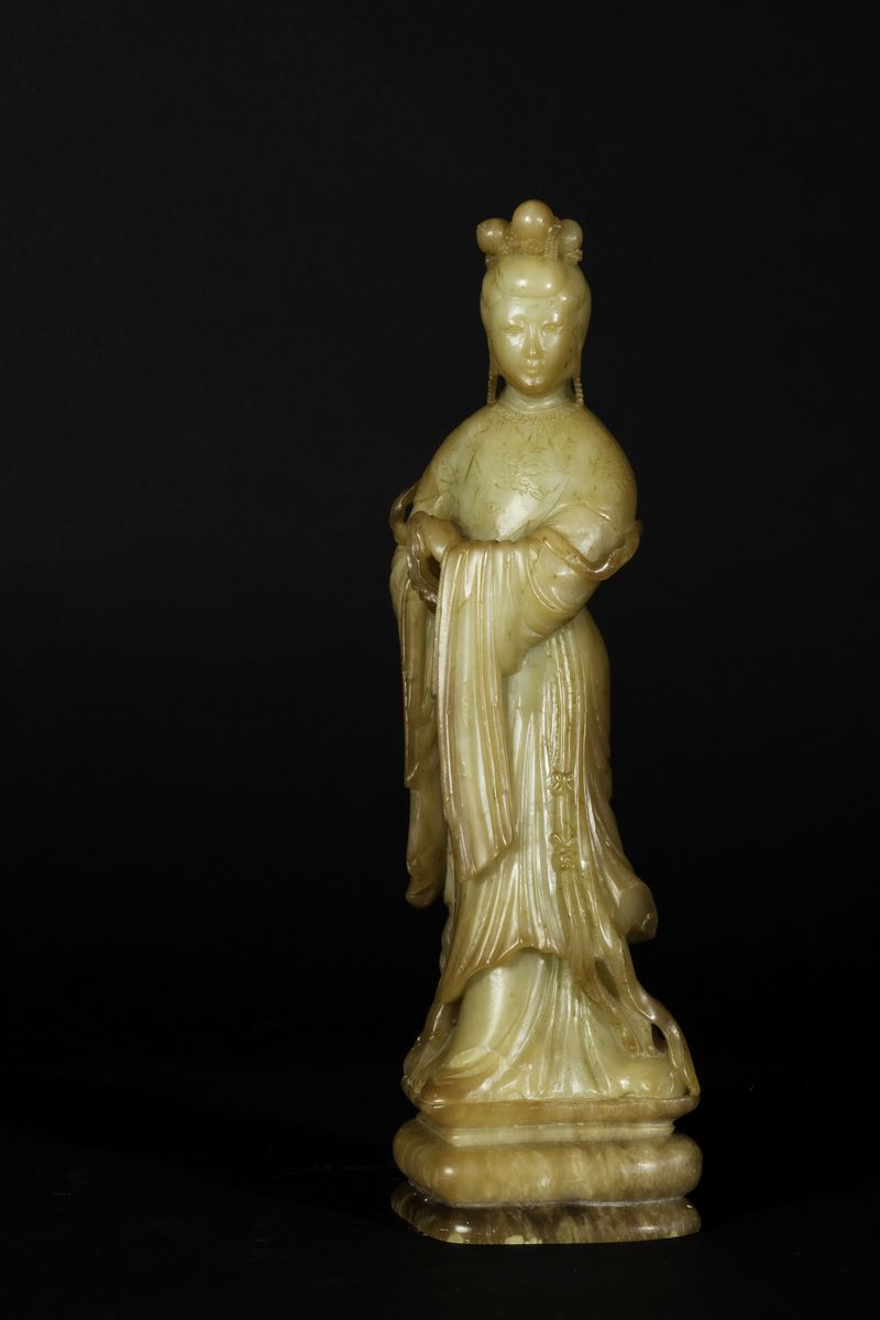 Figura di Guanyin eretta finemente scolpita in saponaria, Cina, Dinastia Qing, epoca Qianlong (1736-1796)