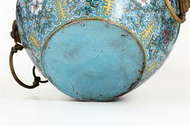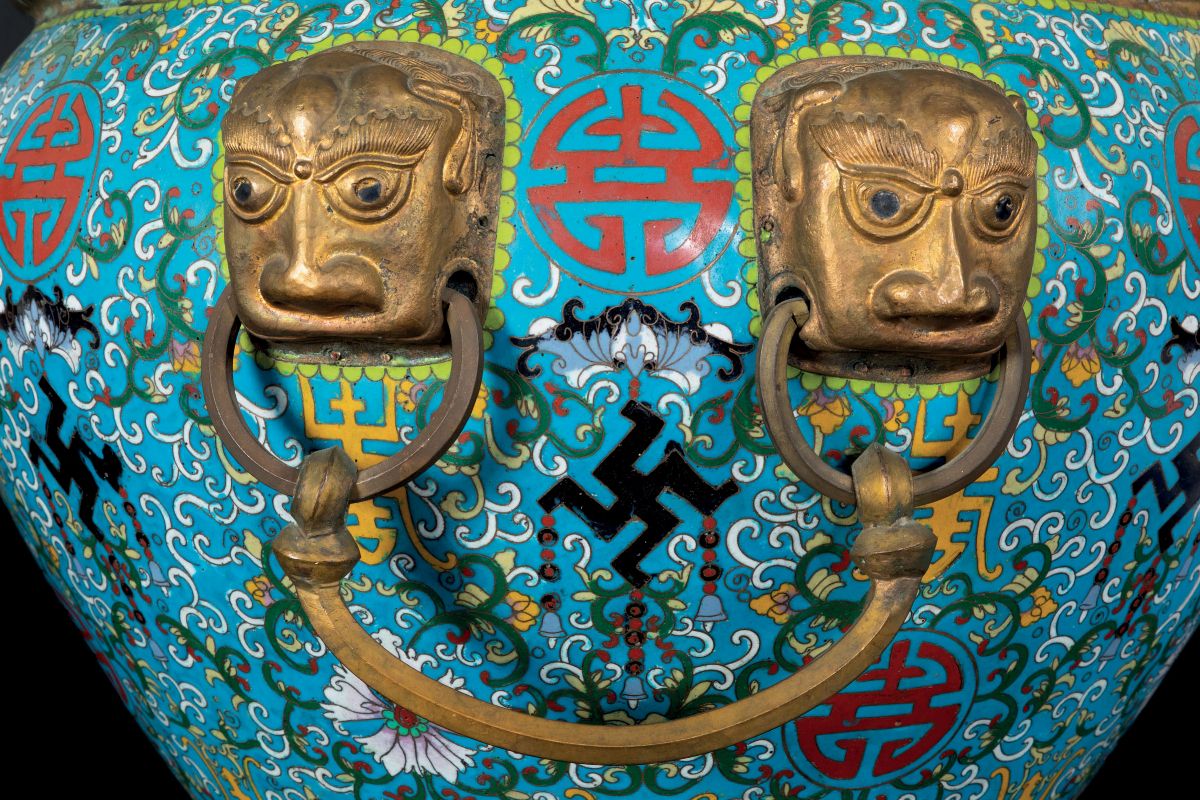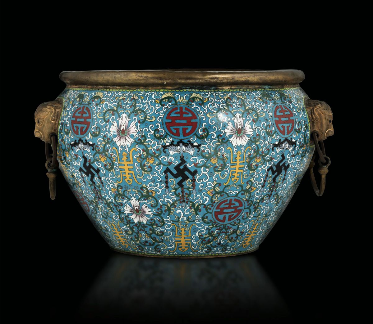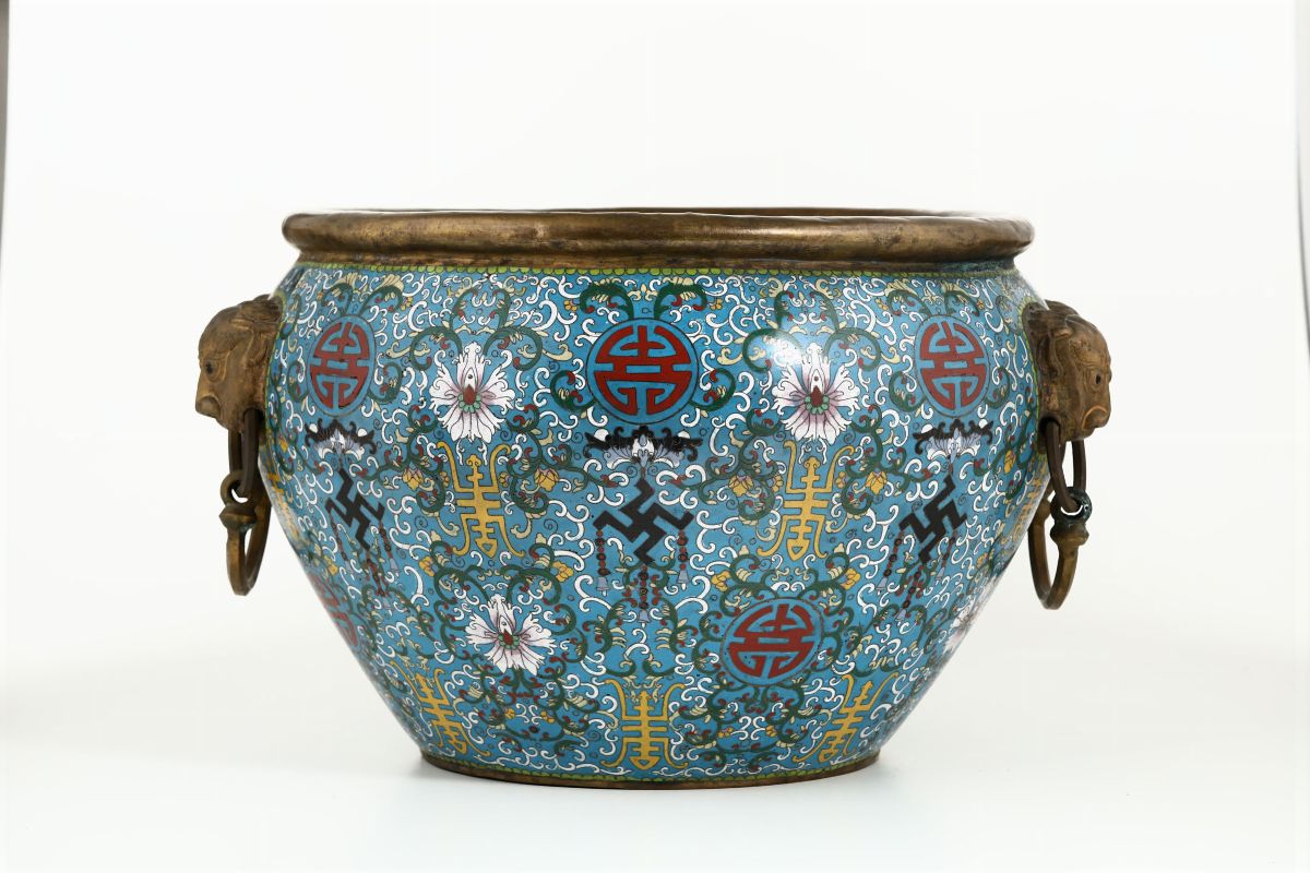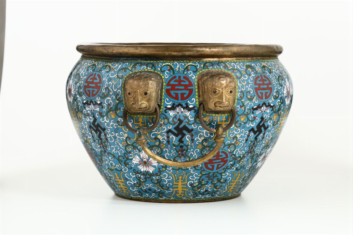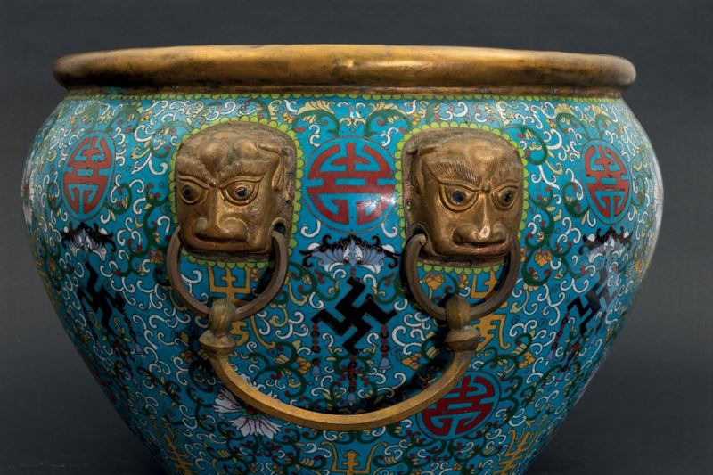 Grande cachepot a smalti cloisonnè con decoro a fiori di loto, simboli taoisti a anse ad anello con mascheroni a foggia di testa di leone, Cina, Dinastia Qing, epoca Daoguang (1821-1850)