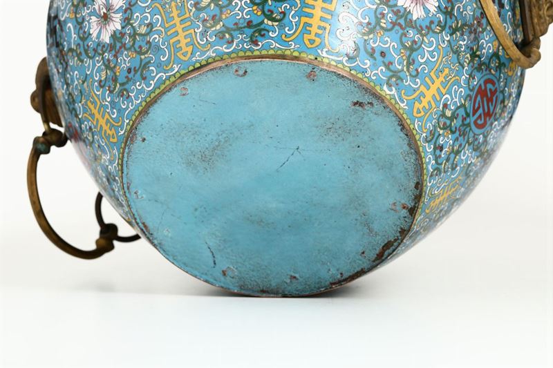 Grande cachepot a smalti cloisonnè con decoro a fiori di loto, simboli taoisti a anse ad anello con mascheroni a foggia [..]