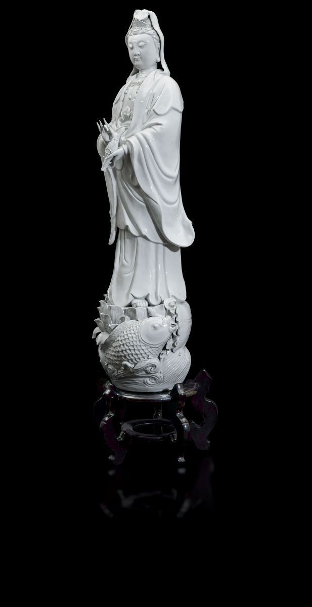 Grande figura di Guanyin eretta su base a foggia di fiore di loto con carpa tra i flutti in porcellana Blanc de Chine, Cina, Dinastia Qing, fine XIX secolo