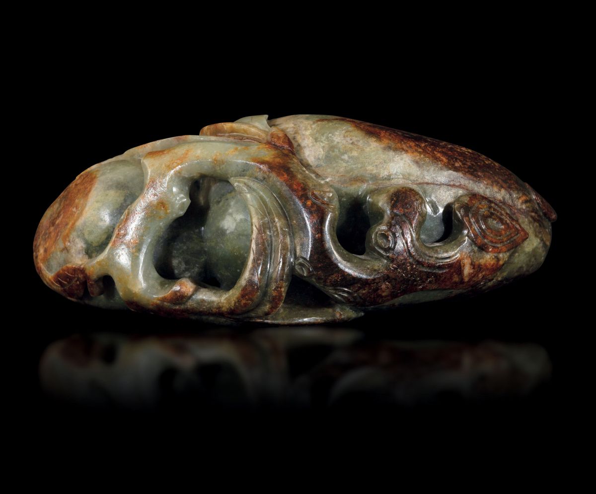 Grande sciacquapennelli scolpito in giada e russet con decoro di pesche e pipistrello a rilievo, Cina, Dinastia Ming, XVII [..]