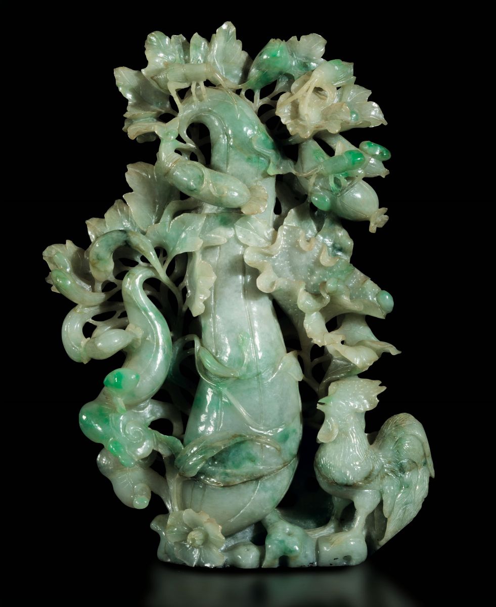 Gruppo scolpito in giadeite raffigurante ortaggio con gallo e insetti, Cina, inizio XX secolo